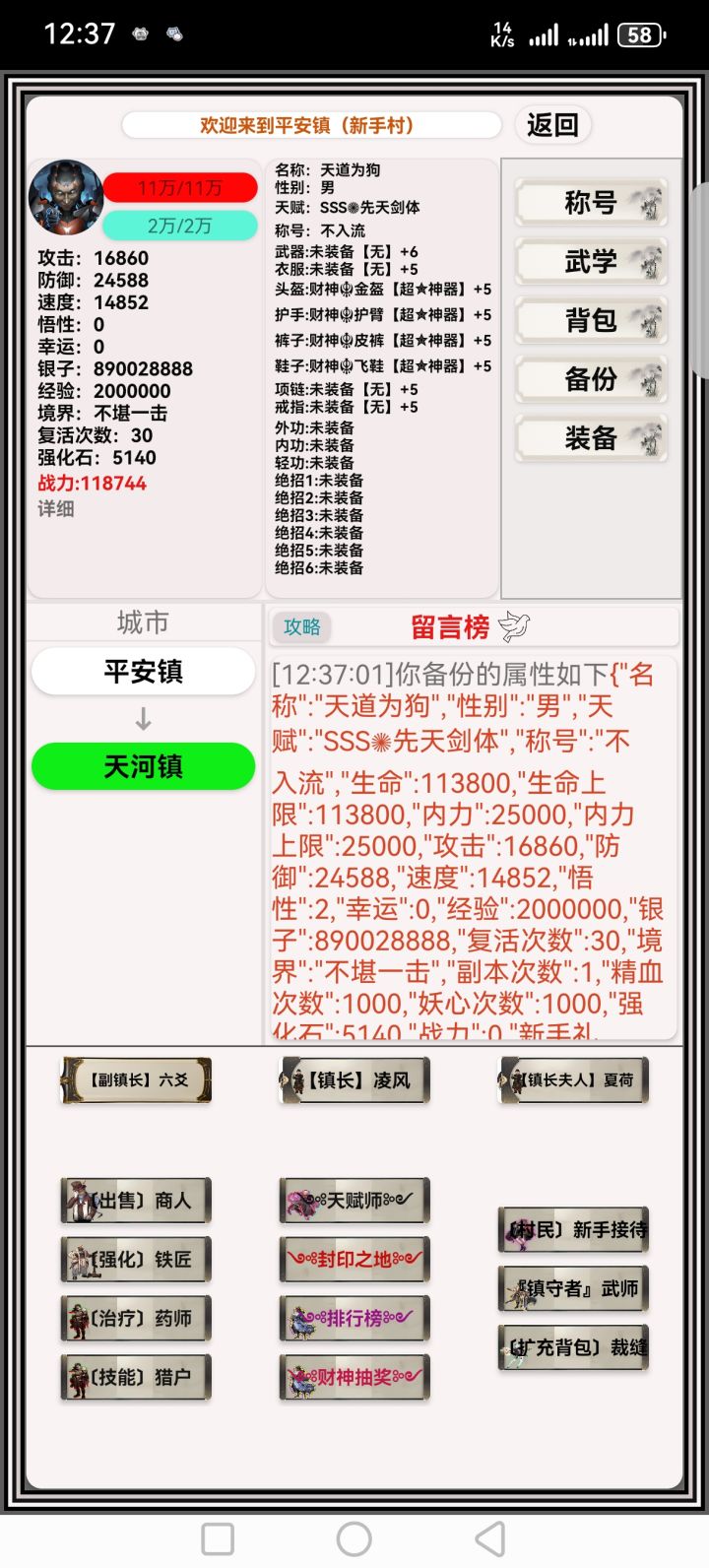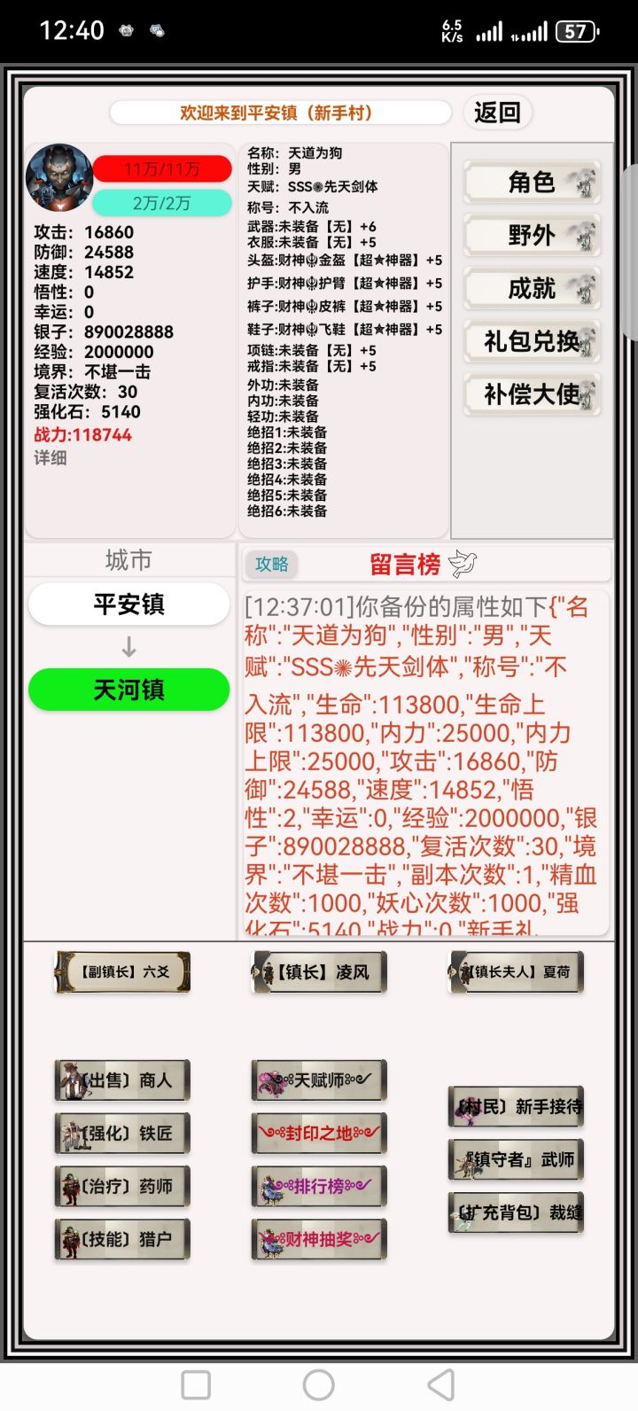 各位大佬们好,玩了一二天的出来的新手村攻略,不喜勿喷。 首先是创建角色这里,任意三s天赋就可以开局,当前剑仙是最yyds的,有恶趣味的可以选择性别为太监,建好号后进入游戏第一件事就是点击礼包兑换输入 最后的冲锋 领取十亿银子开局,然后补偿大使领取四个礼包,再点新手接待领一点微薄之力的奖励,这样开局就非常完美了,点击左下角的铁匠强化装备,最后装备全加6,武器加攻击最好是9,重头戏来了,点击财神
