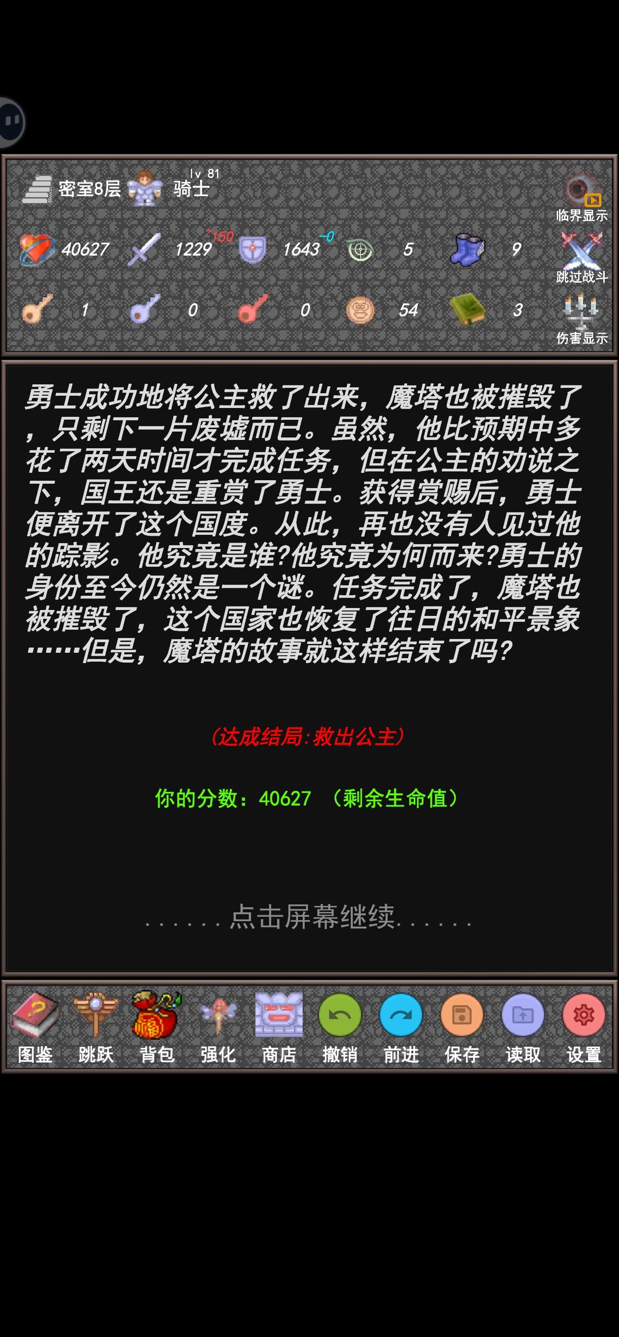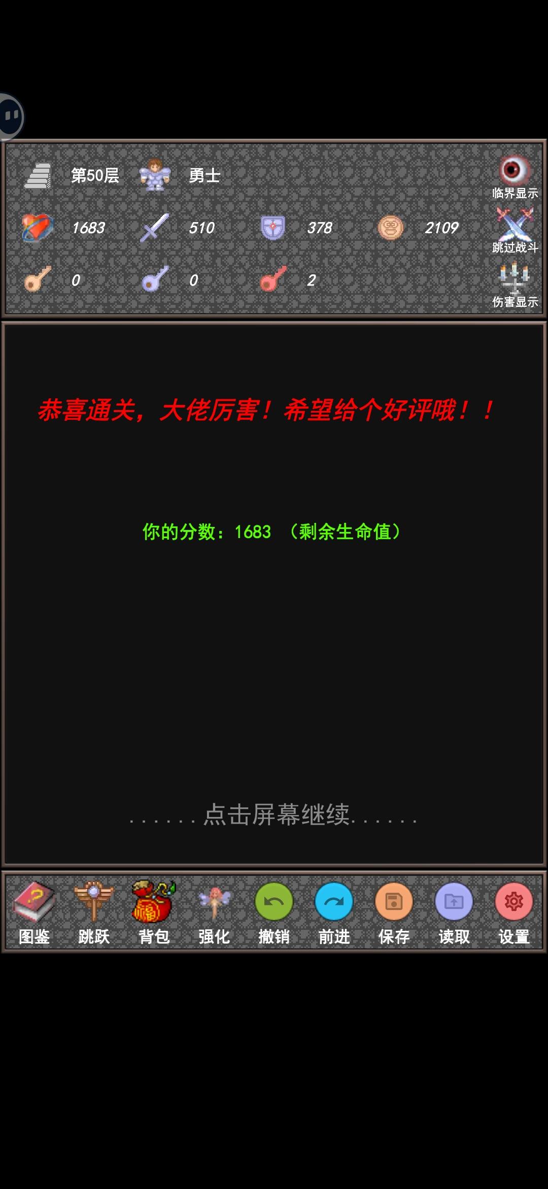 操作很方便。魔塔50层终于无广告通关了,太难了,读档了好几遍。商店无脑加攻击,打高层技能怪得算数值,能不打就不打,等攻击够一刀秒了就控1血去刷怪