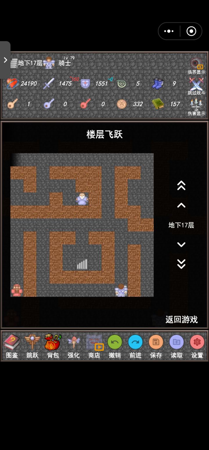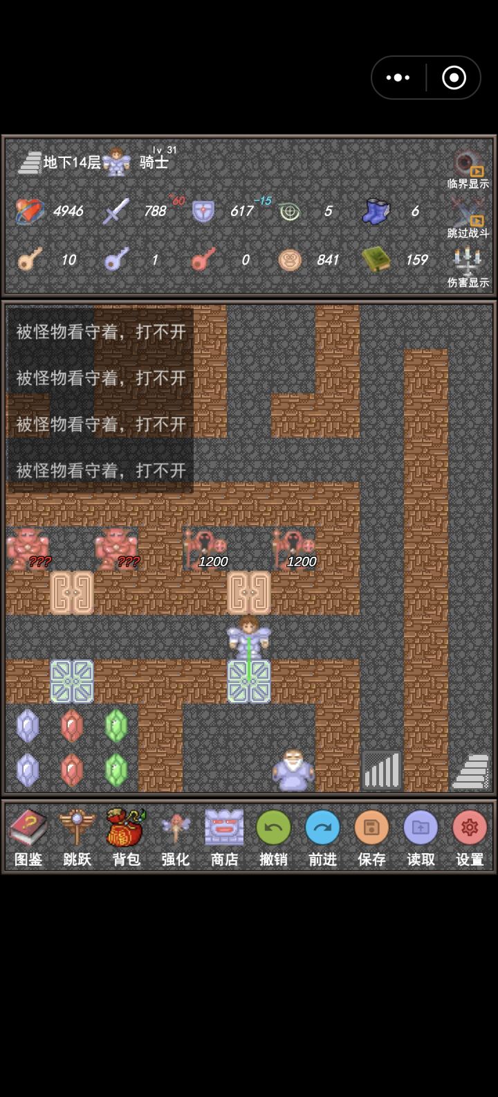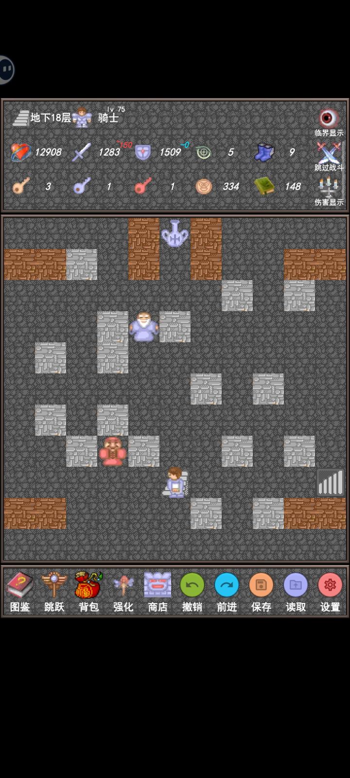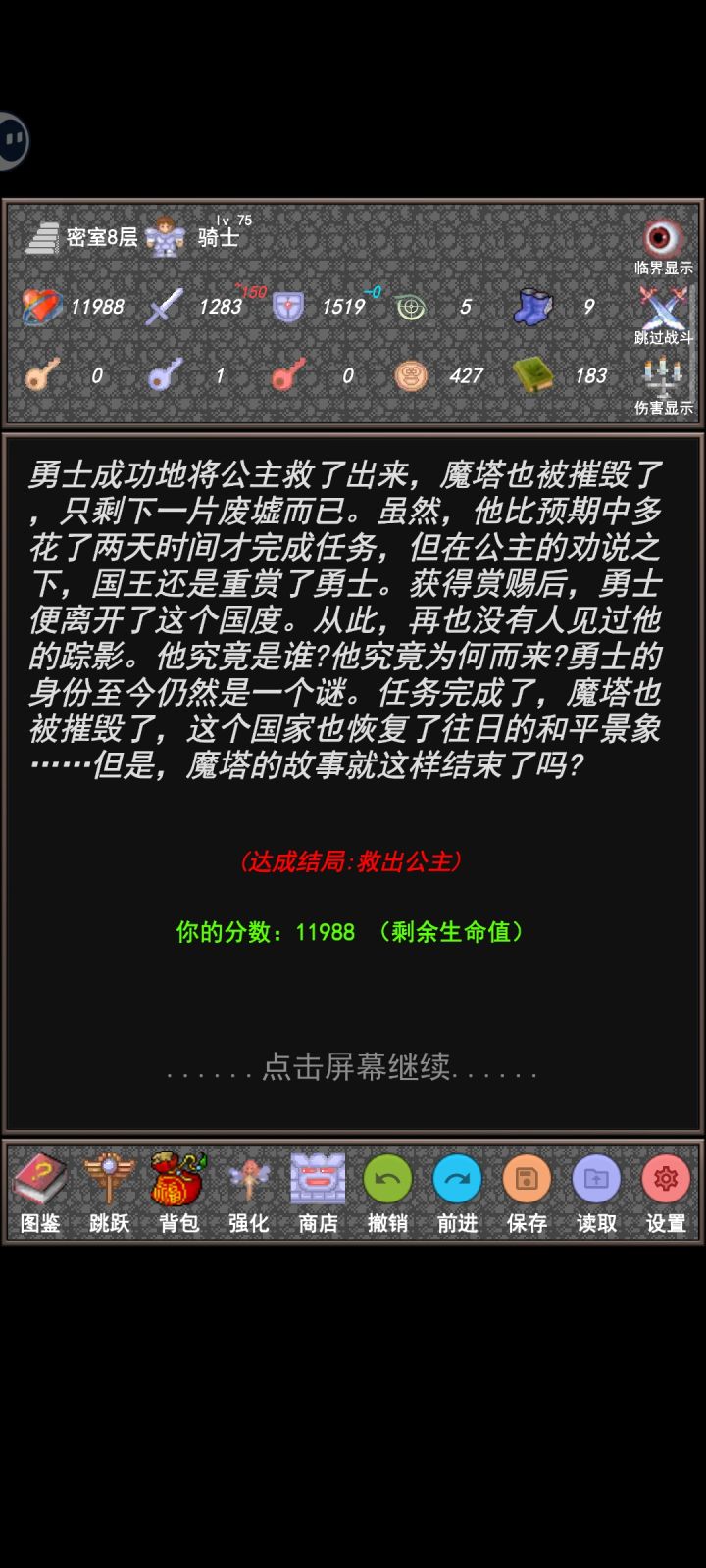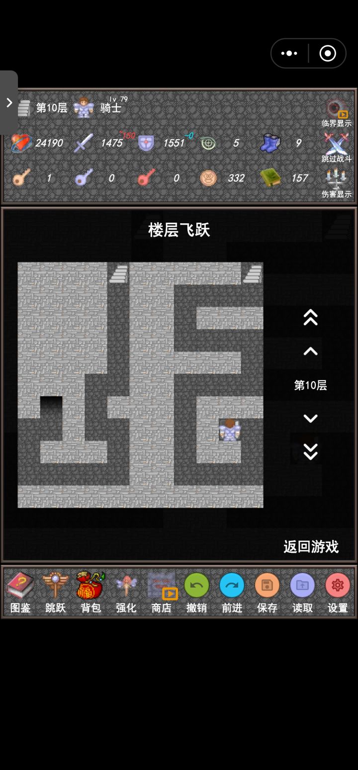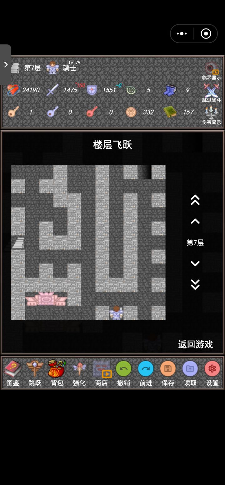 发现无伤魔王后还保留了其他容错。没喝圣水,密室第6层(应该是地下第17层进的)因挥霍银钥匙没拿任何东西,且还有很多低血怪和高级巫师没清(清完还能剩不少钱)(也多亏没清完,不然我一股脑全提战力了,最后那一下就买不起黄钥匙换镐子救公主了)。这是我第一次通过新新魔塔,跟大佬比谈不上有多细。🤔我想请教一下各位大佬,高级巫师要不要打?调攻防都对她效果甚微,魔王都能无伤打过的情况下,她还能吃我血,好像会加