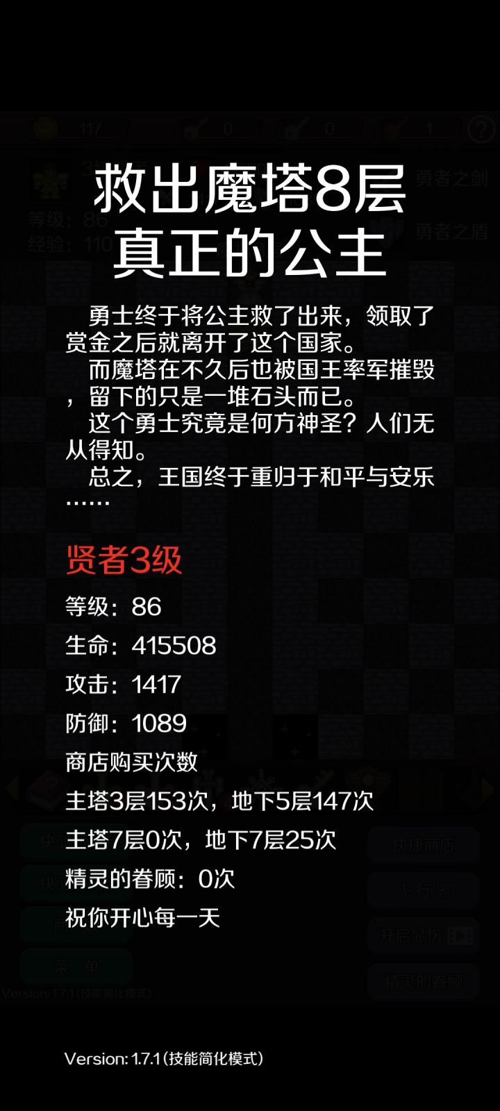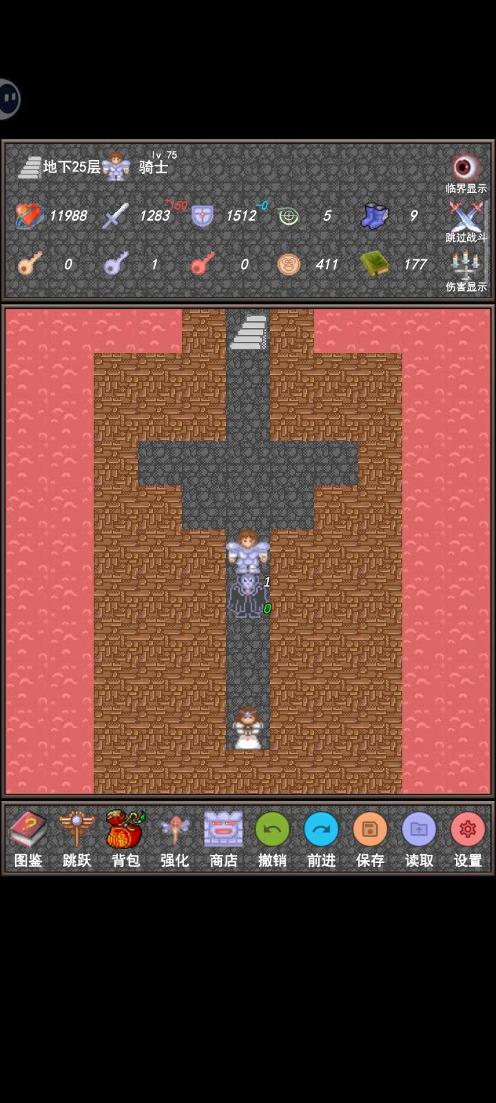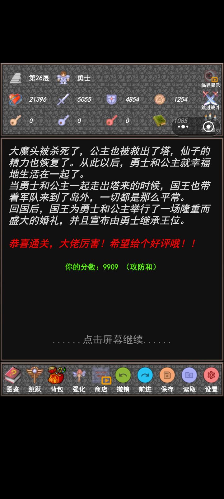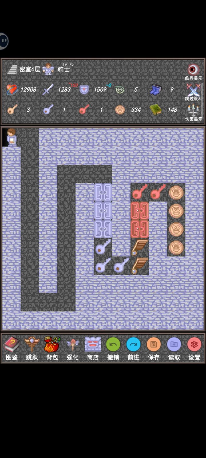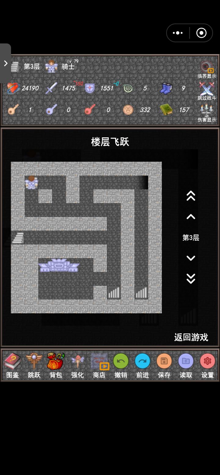 发现无伤魔王后还保留了其他容错。没喝圣水,密室第6层(应该是地下第17层进的)因挥霍银钥匙没拿任何东西,且还有很多低血怪和高级巫师没清(清完还能剩不少钱)(也多亏没清完,不然我一股脑全提战力了,最后那一下就买不起黄钥匙换镐子救公主了)。这是我第一次通过新新魔塔,跟大佬比谈不上有多细。🤔我想请教一下各位大佬,高级巫师要不要打?调攻防都对她效果甚微,魔王都能无伤打过的情况下,她还能吃我血,好像会加