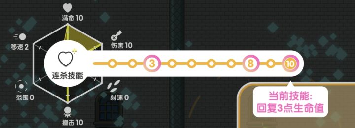 1.撞击、伤害、生命必须升到10级2.技能选择血包、经验、可撞击子弹3.剩下的点数自行安排,子弹穿透不用选4.初始状态最多能升到36级,如果操作好基础技能可以先不升级,攒够500分优先升级连击被动,后期的生存率会大大提高5.提升等级上限后,建议把攻击范围升满,40关以后用处很大