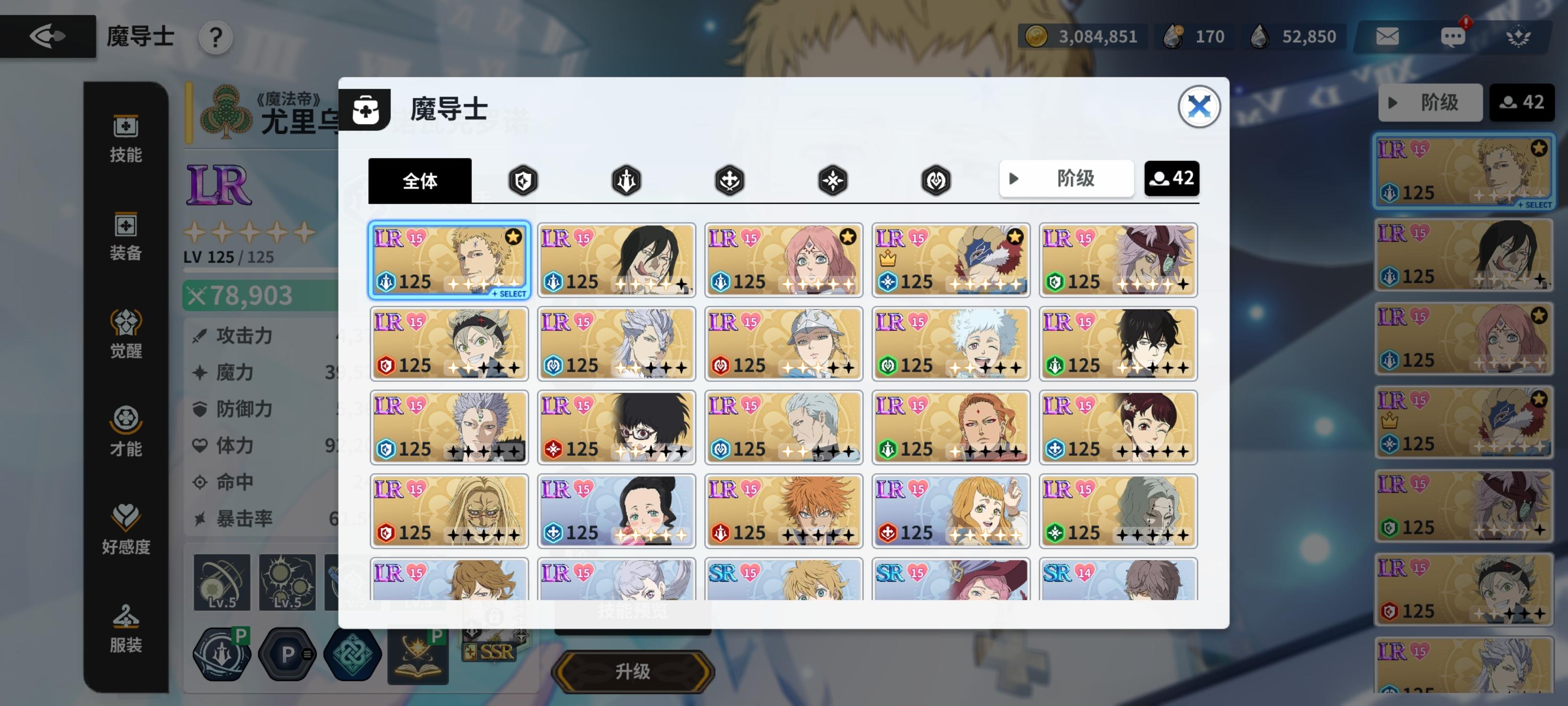 各位佬们,现在还有30个万能碎片和两个常驻角色自选,一个常驻武器自选,我的池子有啥角色是比较值得升🌟🌟的呀125级的除了烟男和水鹿团长其他都有专武,狮子哥也有一把#黑色四叶草魔法帝之道 #黑色四叶草魔法帝之道攻略
