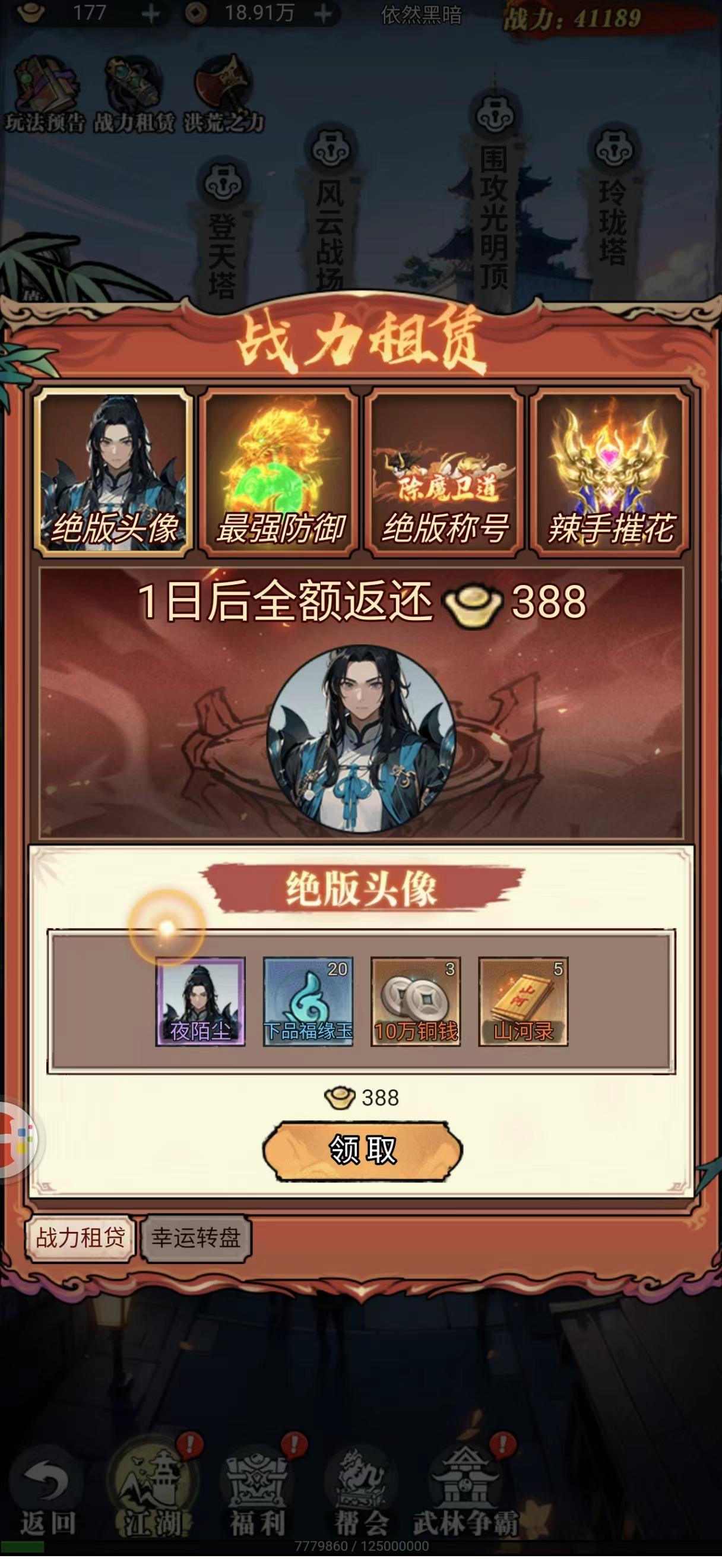 元宝千万别乱花,商店和7日里的东西都不要买,优先攒够买战力租贷一天后全部返还,之后元宝全弄功勋特权