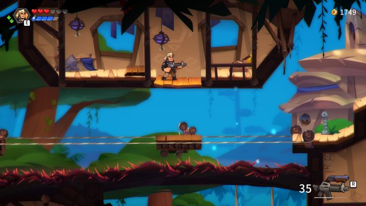 在探索游玩时,随着支线任务的触发和完成,玩家也会在大本营解锁更多的NPC商店来获取武器和能力升级,通过打败敌人获得的金币或收集地图中各个隐藏的强力道具来合成强力武器。
