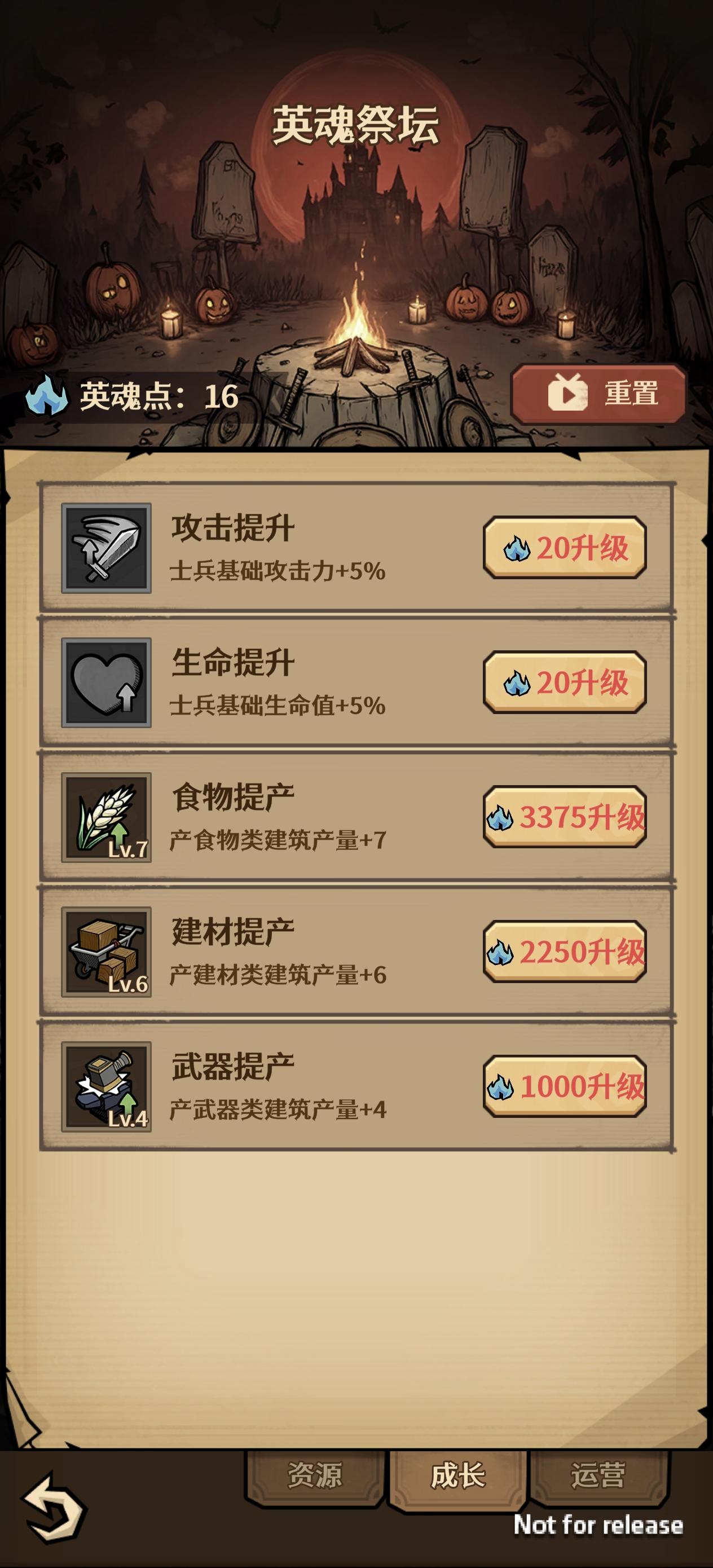 前期英魂点不够的时候可以出门全点加基础的,然后进去把资源用掉,然后保存返回重置全点成长,再进游戏就会发现之前的资源还在,作物产量加成也生效了,最后一关的时候再换成英魂点收益,等于白嫖2倍的英魂点