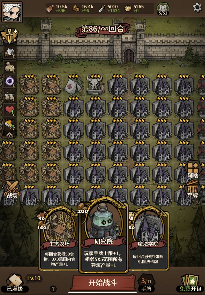按粮食来算的话Lv3研究院增加(5*5-1)*3=72,再减20维护消耗,只有52。一个Lv3的生态农场90+3*3=99,再加上周围八个农场对它的增益+8,一共是107个,是研究院的两倍多。如果不是非常需要手牌上限的话,研究院完全是没必要的存在。建材同理。至于武器,由于武器放置需要消耗金币,在前期放置多个武器工厂且缺乏金币情况下,是可以使用研究院作为增益装置的,但是等到局内等级升满10级