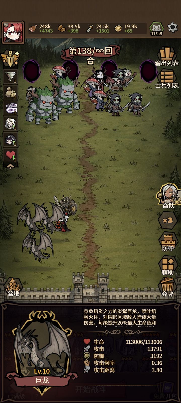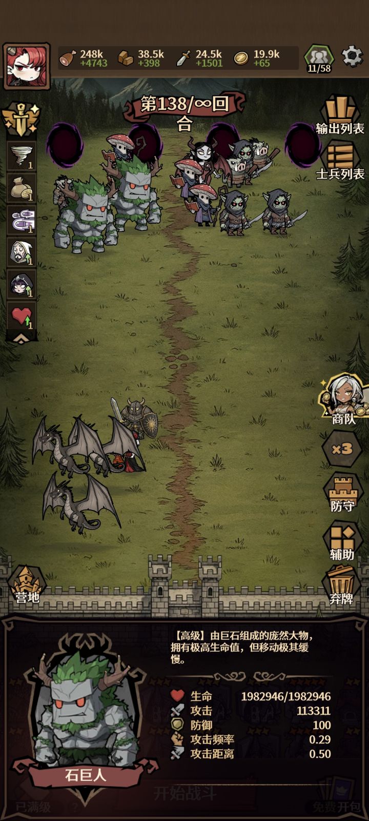 前期尽快升级基地出泰坦守卫,然后多造魔法学院 利用战魂咆哮,不朽铁壁,生生不息 魔法卡牌来增加泰坦守卫的属性。4个泰坦守卫加一个暗影刺客(前面泰坦守卫属性没堆起来有点脆弱,需要暗影刺客切后排,后面暗影刺客用处不大,泰坦守卫没死之前,暗影刺客不会受到伤害。)后面只要防守站位,把怪聚在一起4个天降火球30% 最大生命伤害秒前排,后排也是一样。中间丢丢铁壁术加防御,咒术降低怪物攻击,就随便打了最后