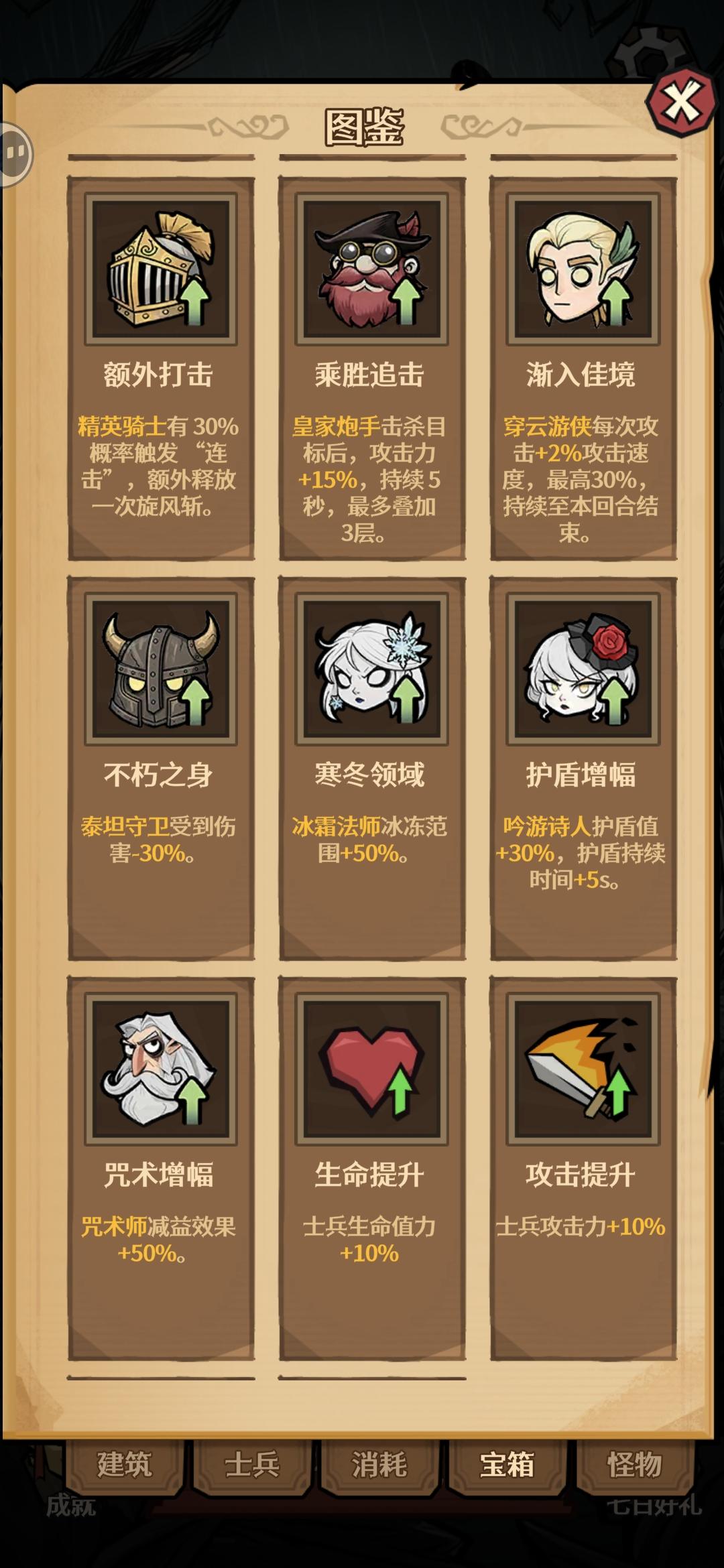 钢铁壁垒:血量+10%→免伤+8%训练有素:攻击+5%→基础攻击成长+5%坚韧不拔:防御+10→血量低于20%免死2秒复仇反击:反弹8%→反弹15%铜墙铁壁:远程免疫50%→远程免疫90%,近战受伤+20%破防箭矢:破防30%→防御永久降低50点,可叠加。大型火球:爆炸范围+50%→火球范围+200%所向披靡:攻击+30%→攻击+100%,血量-30%牢不可破:额外防御+30→额外