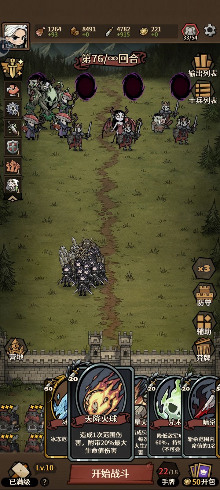 76回合扛不住了,我前期就是先弄木材,弄得差不多了就全卖掉了,然后就是弄一点农田生产武器的比农田多一点,后期武器更重要魔法塔很重要,40回合前尽量多弄几个,后期基本上靠魔法打伤害我用的英雄是加里安,后期就靠守卫扛伤害了,后期建议你们不用搞后排因为脆的跟纸一样,我是守卫扛伤害刺客偷袭后排,因为不会打刺客还有一定要在魔法塔很多之前把兵弄好不然后面开局魔法塔就把卡排位占满了你想买士兵也买不了除非你
