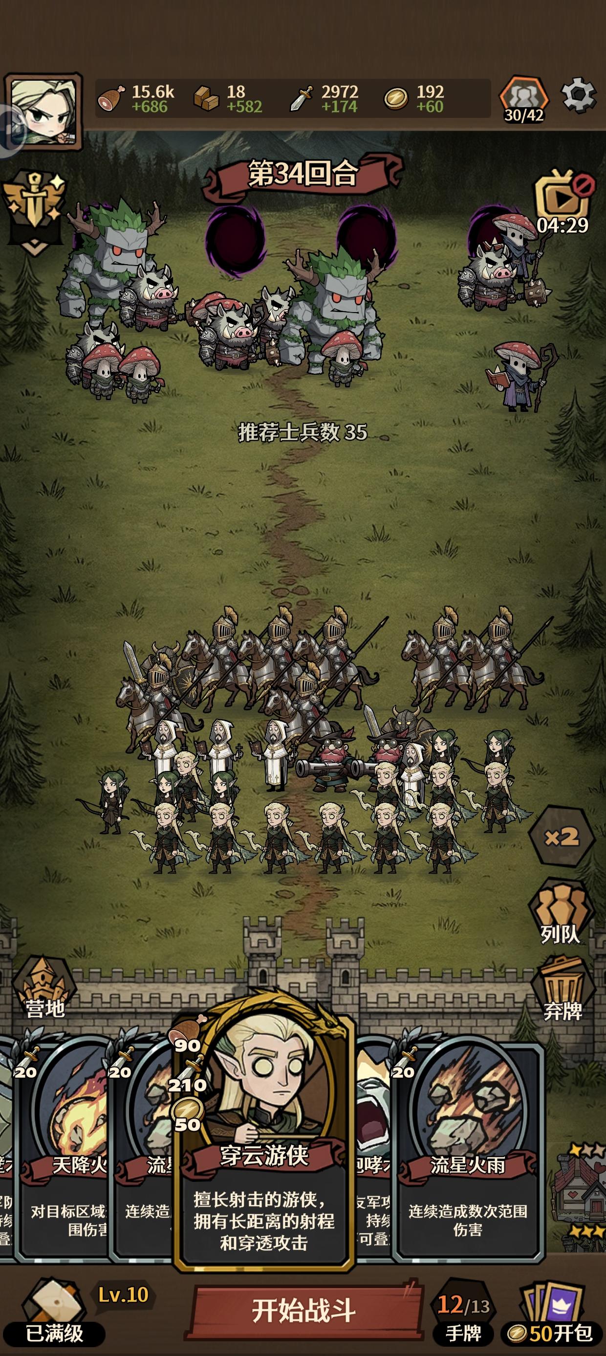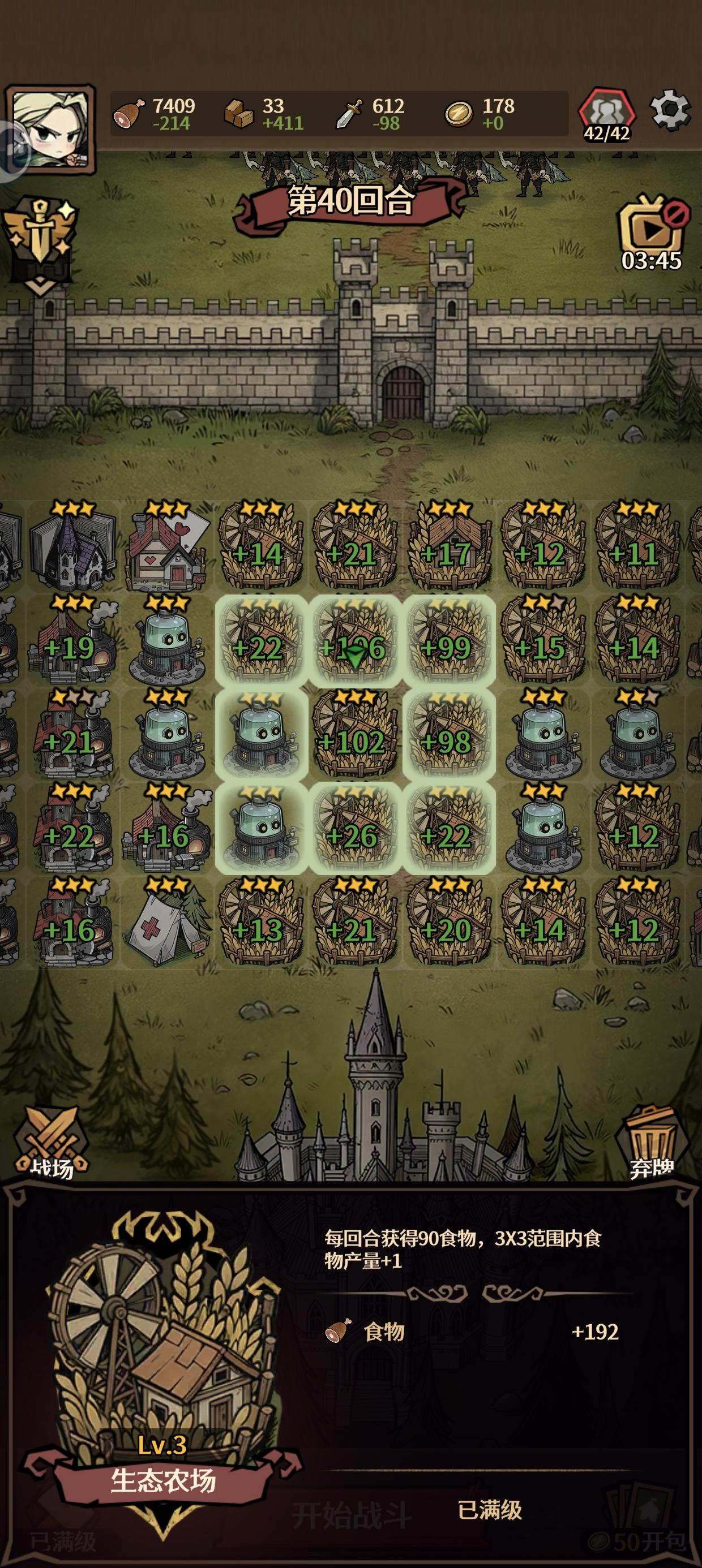 只需要木头和粮食,如果有其他金卡,用上。前面不需要爆兵,第四关开始放龙巢,等先把地种满,等粮食积累到了4500,直接将龙升满,出商店后多刷新,更换建筑等级以及刷其他龙巢。粮食会很多,龙巢出了可以直接升满,本人之前32回合,就4个满级龙,其他兵种不重要,满人就行,直接速推到40回合。