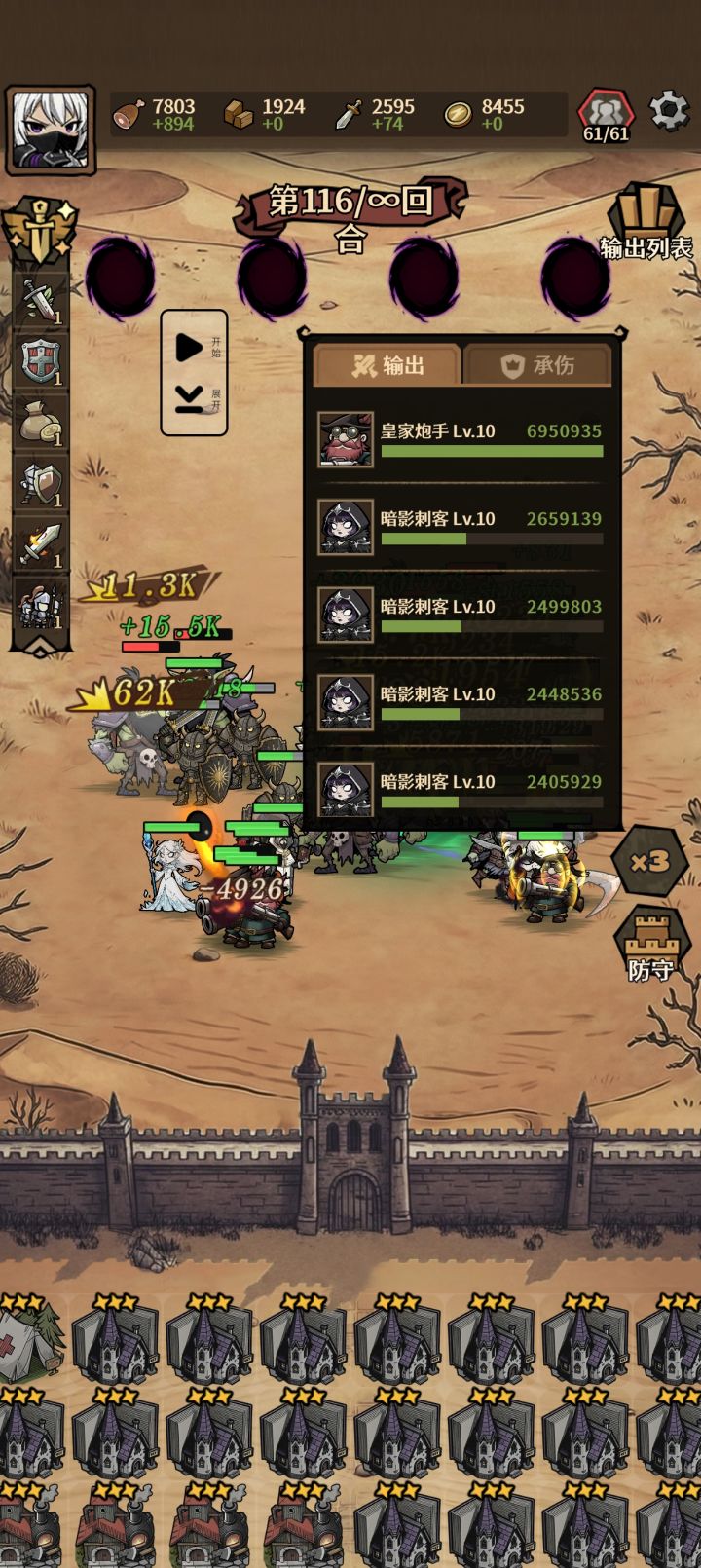 10000+英魂被吞了,,,,,,总结出来了,还是炮手输出最高,但处理不了后排,刺客后期虽然能打后排但太难了,没有aoe。射手伤害太低了,只有炮的一半左右,而且经常射歪,打不了后排。最后,刚打了一局,138关,结果点双倍的时候弹出重新登录,然后奖励没了,心态崩了