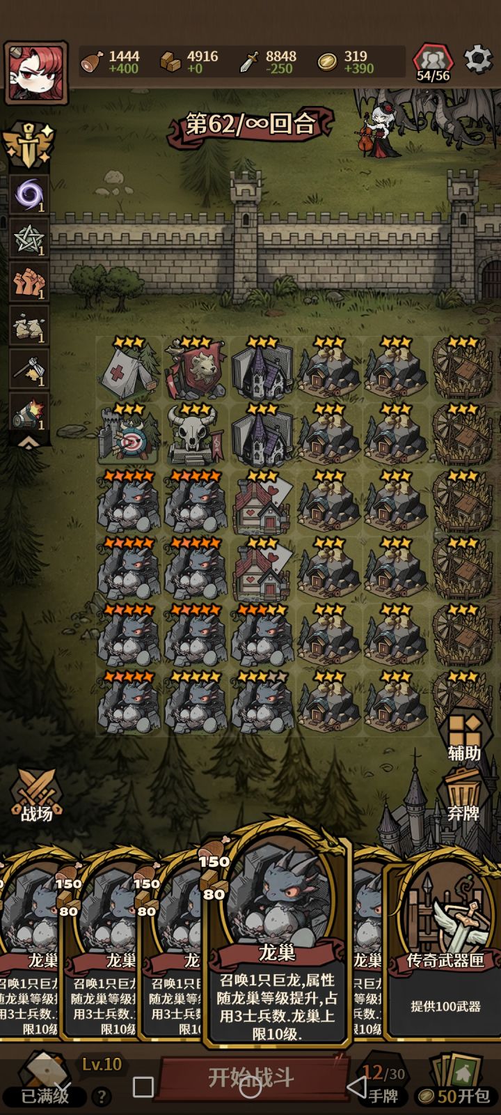 雪地玩不了!!!叠血量还是挺有意思的,正常玩随随便便到一百多,后期就要看手法了,前期中期依靠铁壁、咒术和治疗赖血量,可以单挂底角选防御。前期用免费守卫和牧师过渡,所有带奴隶的建筑都别碰,第一波商店很关键,3抽原则(也可以直接开赌,想玩的爽没抽到直接下一把),抽到泰坦直接把兵全卖掉,只留牧师,必要情况可以上个祭司(只上4牧师和一个祭司,事件卡看情况选额外敌人的),不过后排基本保不住,一直赖到后排开局