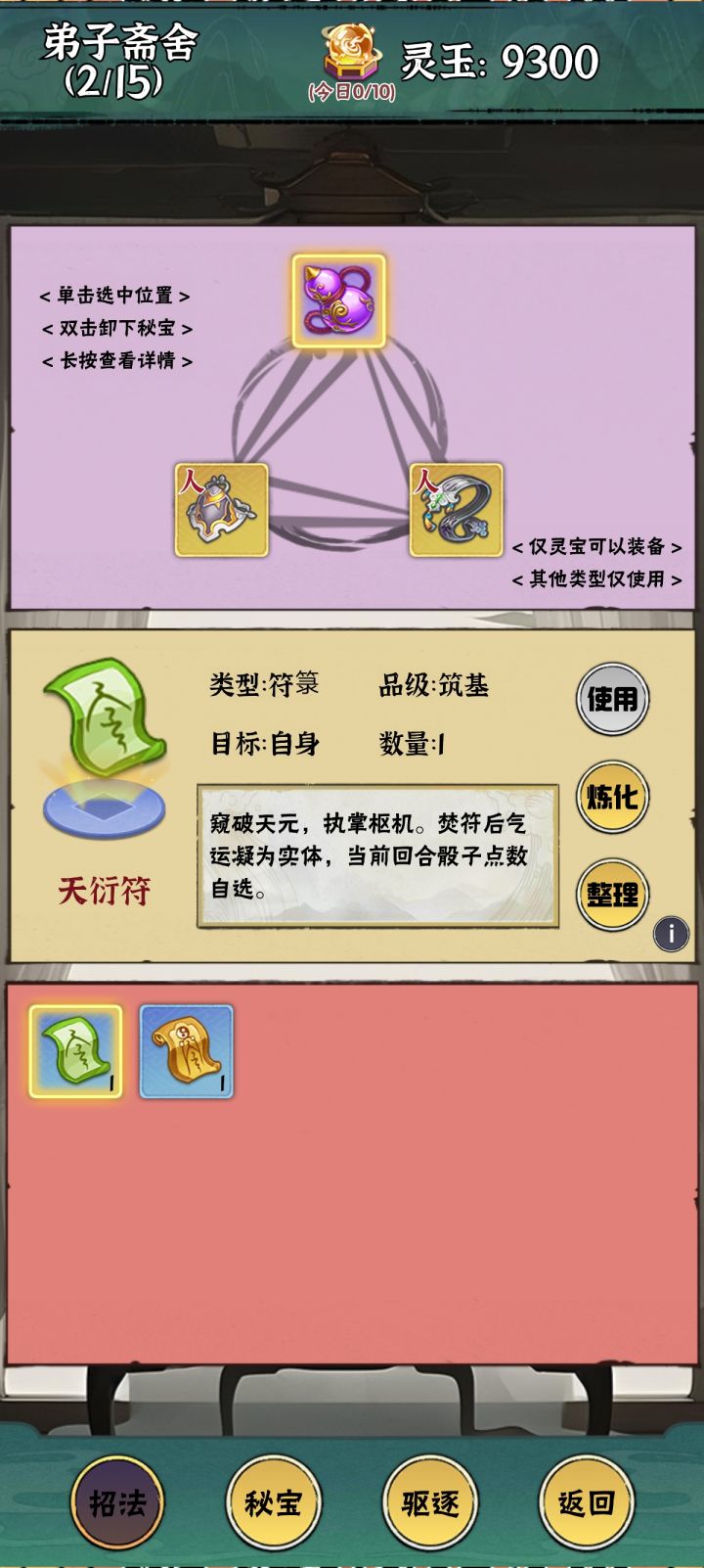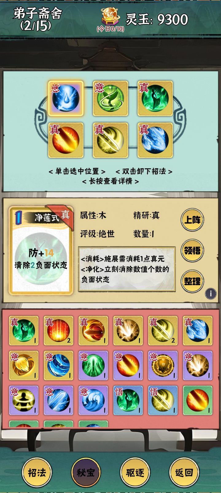 招法(技能)作为游戏极具策略的单元,咱们单开一栏,详细的讨论一下。 游戏的招法分为金木水火土五大类,最多上阵6个招法,对应着1(起势)2(承云)3(峰回)4(天枢)5(归藏)6(定戈)的顺序触发,从1-6对应一轮,玄界内碰到AI一轮就结束,掉多少血就是多少,碰到怪兽则是一轮接着一轮,一直打到一方没血,或者轮战斗不分胜负。 玄界内可以二合一升级,升级后属性获得加强,可在宗门圣地预览。初始1级对应