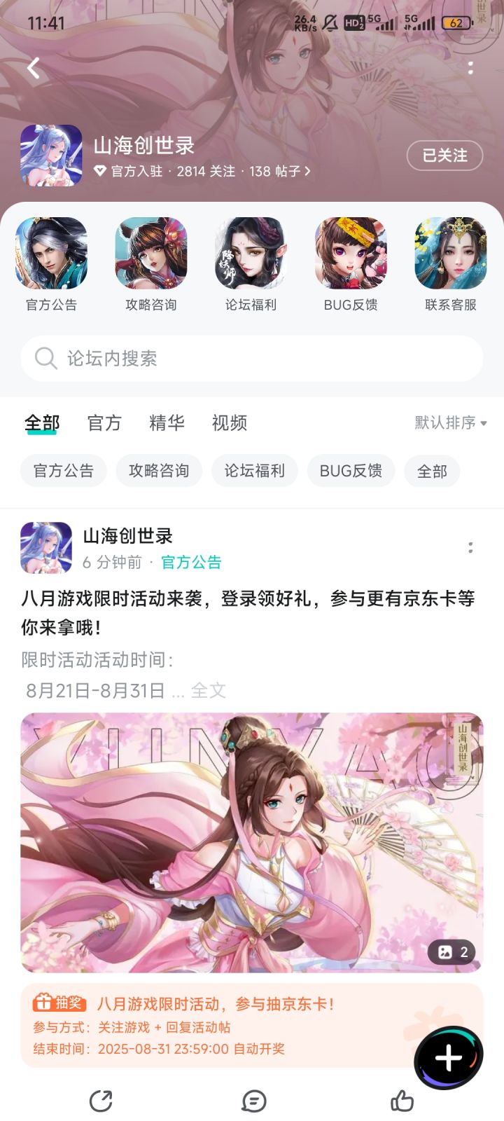 【京东卡抽奖活动】▶ 参与方式 1.点击关注《山海创世录》并发新帖晒截图 2.在本帖下方评论区分享发帖链接即可【奖品发放】到达开奖时间后,由taptap系统随机抽取符合要求的幸运玩家,自动发放兑换码(对于同一账号大量故意发布评论刷楼层导致其他玩家中奖概率降低的行为的用户,将会可能被取消参与资格!)▶ 活动奖励 活动结束后将抽取1位幸运儿获得1张100元京东卡添加客服解锁更多机缘:📢