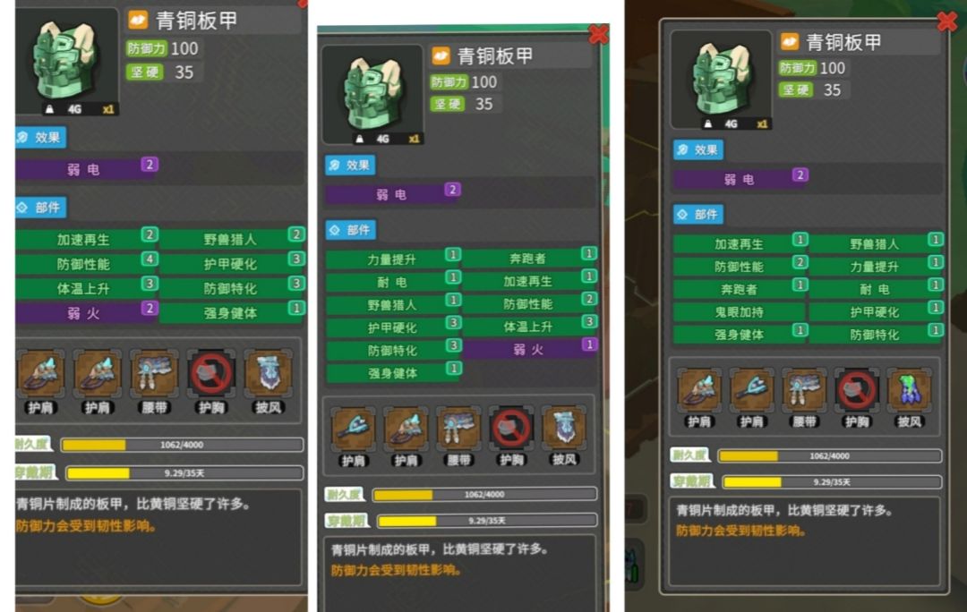 防御力超强的牛牛护甲 没啥伤害,我偷袭打熊大一波只能打四分之一血,但是比较很肉容错高,穿这套我能抗熊大四下攻击,鞋子穿狼鞋。 野猪攻击四件套 这套伤害高,特别是打野兽,就是脆,我偷袭先手一波能打掉熊大四分之三血量,穿这套熊大一巴掌打我大半管血,两巴掌给我呼死,鞋子穿狼鞋。需要注意的是猪皮腰带好像不能直接解锁,我印象中是开蓝图获得的。 跑图闪电狼套 这套奔跑速度快,体力消耗慢,非常适合跑图,且有很高