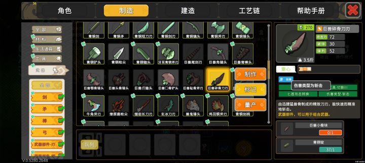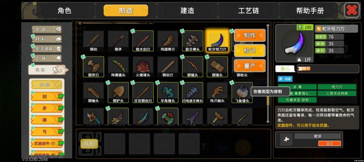 巨兽匕首:巨兽碎骨刀刃+炽杨刀柄攻速快,伤害高,手感好,刀柄只推荐炽杨刀柄哈。巨兽长枪:巨兽尾剑刃+长柄(青铜最好,前期没有用竹子和铜也可以)伤害较高,手长,但后摇比较长手感不是很好,配合熊大套的击退可以实现你能打到别人,别人打不到你。比较推荐长枪武器,前期也可以用铜长枪过渡