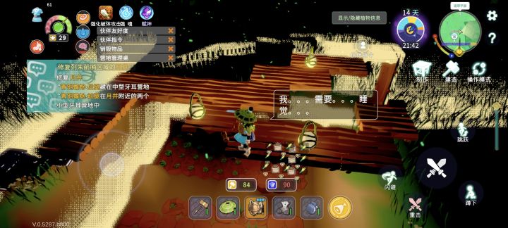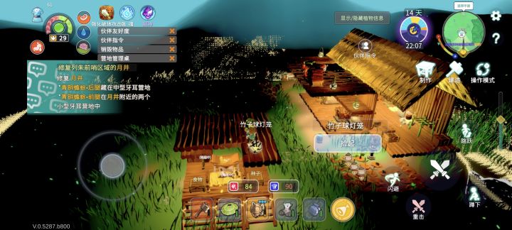 竹子灯笼(猪油*1加竹子),光照范围看着蛮大灯笼直接放在建在高层的原木地板上,不用使用铜挂钩。原木地板有缝隙可以透光,漏雨水(夜里种地应该也不影响)。但是万象壶收家收不进去放在木板上的灯笼