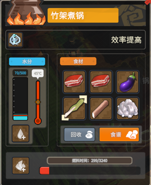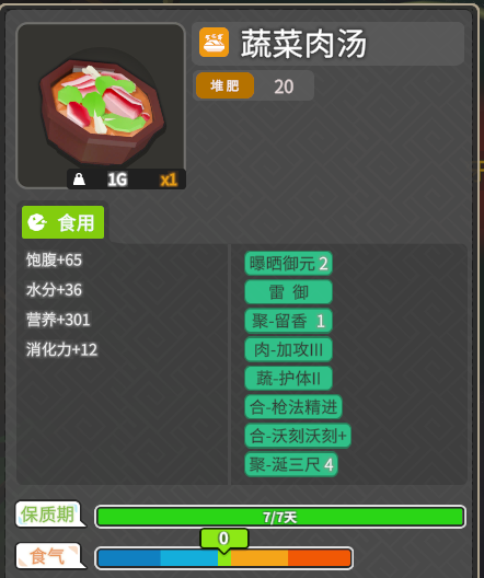 食物中“沃克沃克+”可以提高伙伴80%工作效率,“涎三尺”加消化速度,其他词条加攻击防御等,白菜干是 竹簸箕+竹架 组合(可以叠加多层)晾晒