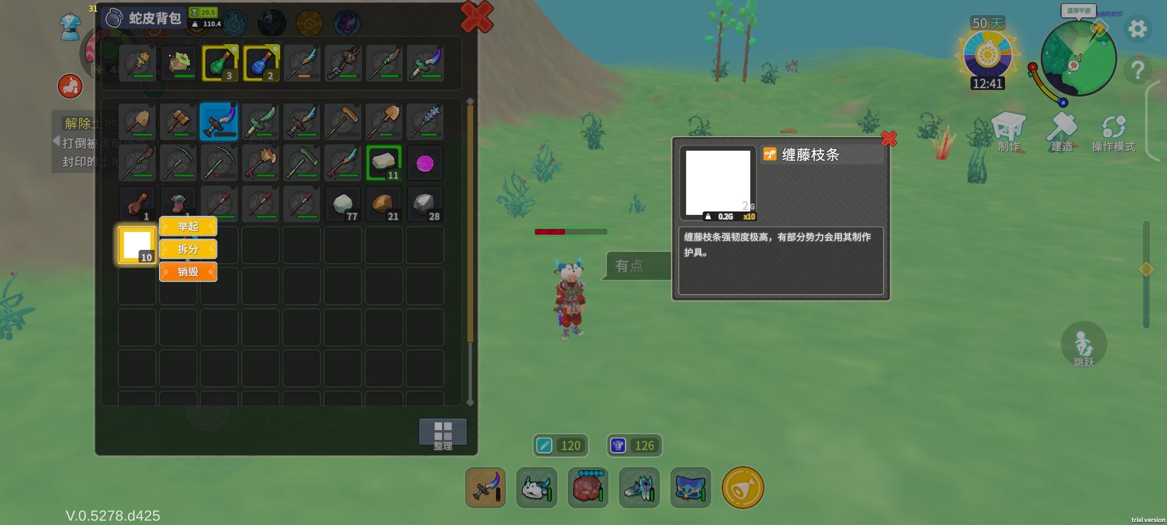 开图无聊,就用毒小刀打大象去了,磨了十几分钟打完天塌了,就这么点基础材料,这个藤蔓我也不知道有啥用