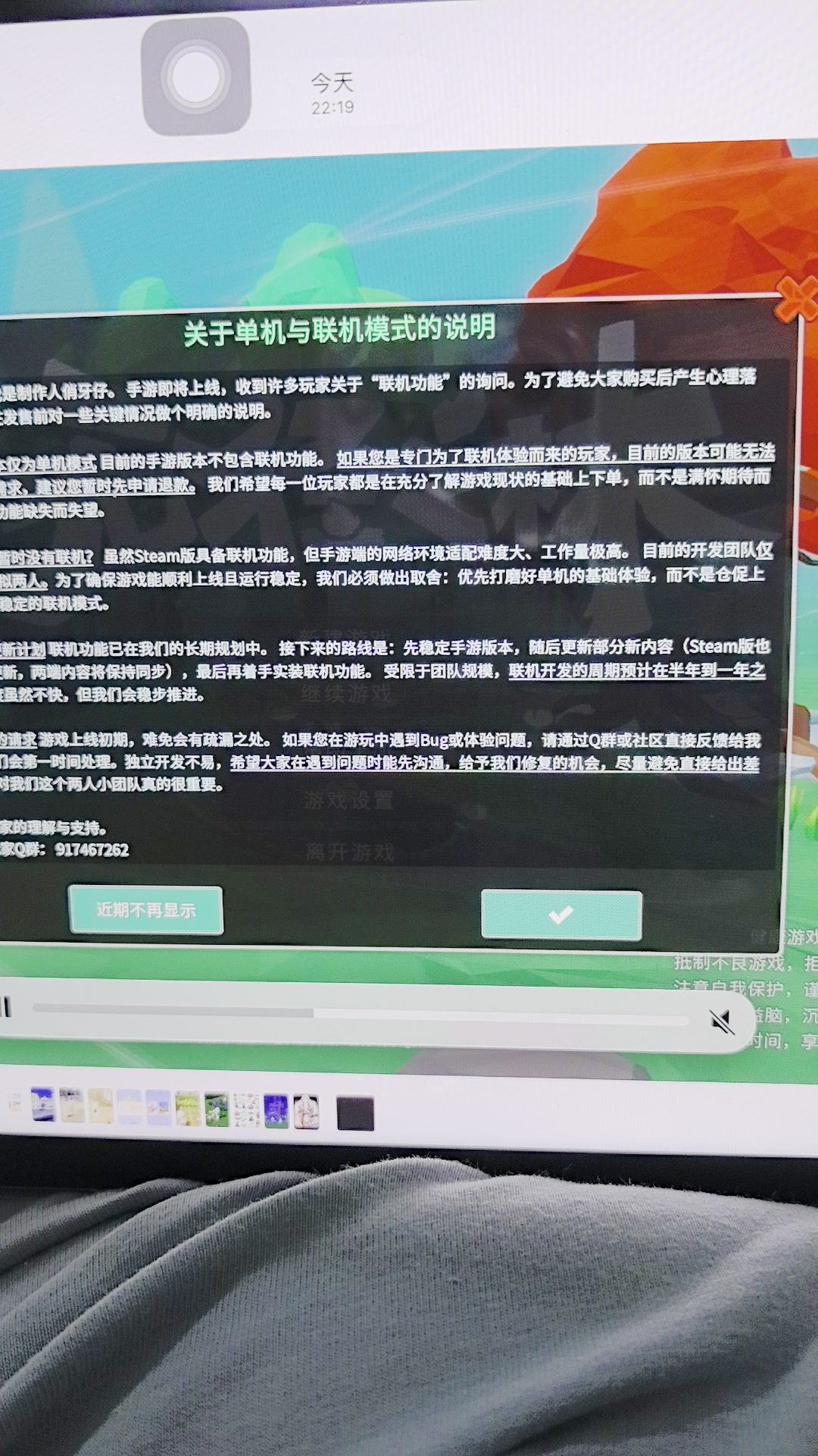 本来改名改错忘记删以前名字了不想发评论,现在不得不顶着这个雷霆昵称反馈bug,小米做适配确麻烦,但是这个bug我已经反馈三天了结果今天更新居然没修害我白高兴,好不容易找个风水宝地准备建家大业了结果铲地不显示进度光铲了,这几天就等着修完狠狠爆肝,结果还是一坨,哎