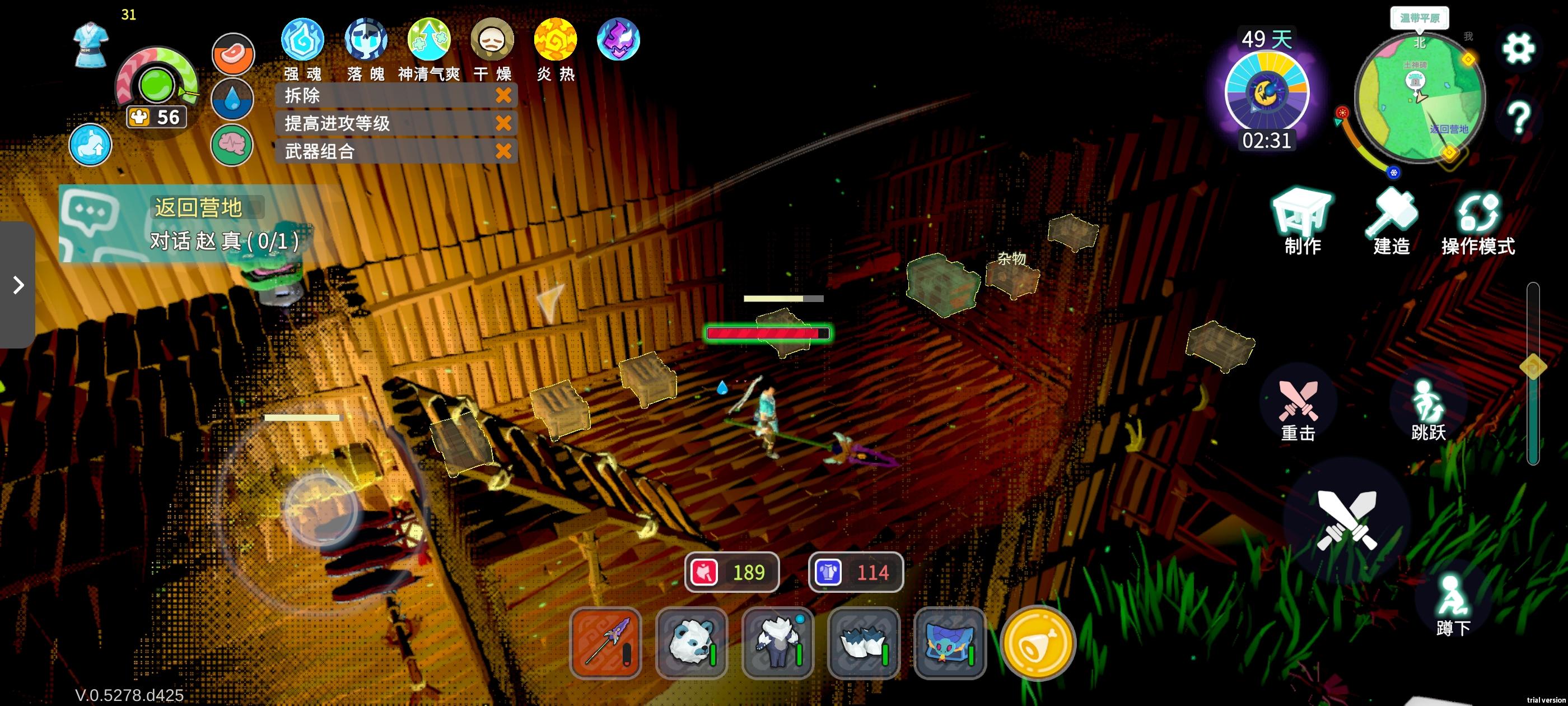 声明:该帖子里面BUG发现和建议仅是个人目前主观的观点,不代表官方最终优化。如果您发现了更多游戏BUG问题,欢迎评论!首先完成指引后路标都会消失,只有新手第一次“长按拾取所有物品”该路标不会消失。例如“坐在椅子上可以恢复血量”,切换建筑模式可以快速拆掉建筑”该路标都会消失。竹林任务的青蛙腿可以正常掉落,桃林的不能,卡在空中,搭上去也无法拾取。原本以为满血,却突然暴毙,但是不知道怎么卡出来的了