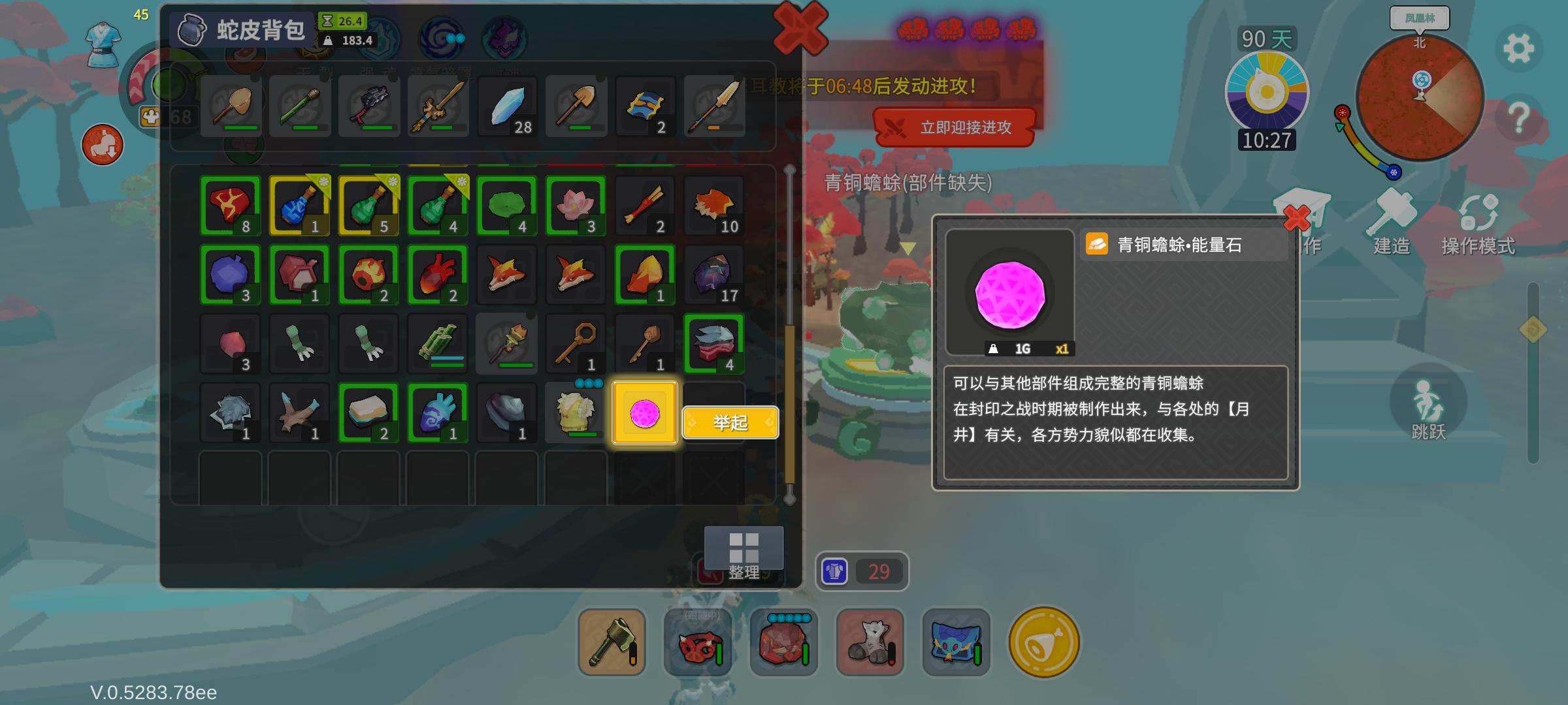 第一天造完6X6,全铜工具。快速跳过任务,只采集当前所需资源。直接燧石刀砍鸡王,草和麻只切割(困难难度记得保存,注意走位,一般一到两次就过了)搞完造镐子敲铜矿,配套设施拉好。边烧矿边采集资源扩家,石头搭配平顶房子省材料(可以先一面墙,房顶竹子或木头)后续高级材料再升级改造。有了铜工具再搞资源,效率暴增,6X6房子刚好满足前中期空间。(熟悉或者节奏快的,所有解锁设施拉满,盖到草盖土窑)重