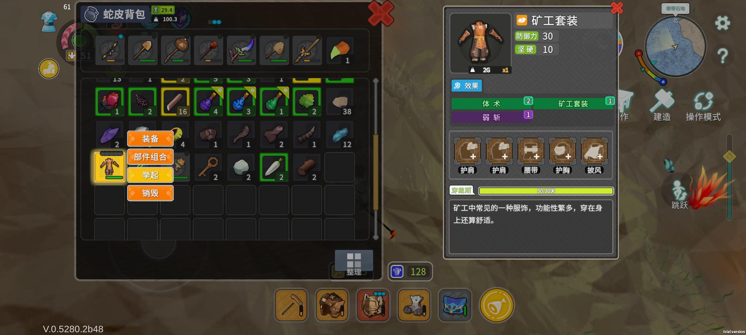 防御力超强的牛牛护甲没啥伤害,我偷袭打熊大一波只能打四分之一血,但是比较很肉容错高,穿这套我能抗熊大四下攻击,鞋子穿狼鞋。野猪攻击四件套这套伤害高,特别是打野兽,就是脆,我偷袭先手一波能打掉熊大四分之三血量,穿这套熊大一巴掌打我大半管血,两巴掌给我呼死,鞋子穿狼鞋。跑图闪电狼套这套奔跑速度快,体力消耗慢,非常适合跑图,且有很高的力量加成,最重要的是前期获取容易,杀几头狼就能搓一套配上木甲