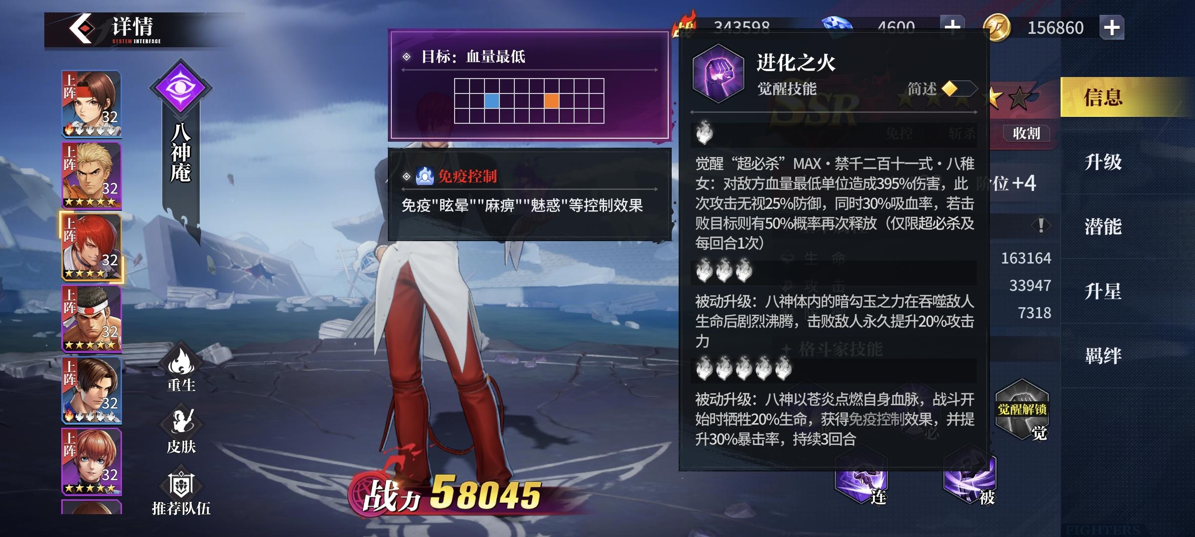 #kof新篇测试 #代号97 从目前角色来看,最强阵容全部围绕八神组建,特别是觉醒后的八神,超必杀锁定血量最低,收割几率再次释放,自身免控吸血无视防御由此有两套阵容推荐八神莉安娜后排秒杀,搭配克里斯金,1号位站个防御即可八神特瑞大招流,陪罗伯特加暴击,坂崎良一拳超人,特推本身伤害也非常离谱,暴击直接融化2个其他队伍火队的镇元斋觉醒后伤害也非常夸张第二天的大蛇经过调整目前看起来也是竞技场