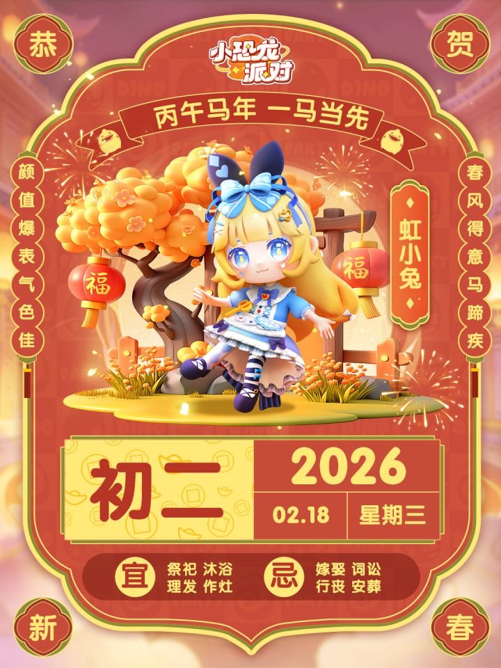 正月初二走亲访友,虹小兔也早早打扮得容光焕发!穿最得体的衣裳,见最想见的人。今天你的状态是“热情社交”还是“乖巧待客”?评论区聊聊你今天的【行程安排】,或者是收到了哪些【奇葩又有趣的拜年祝福】吧! 今日限定兑换码:ZYCERGHF(正月初二容光焕发) 【最后附上专属福利】《小恐龙派对》新春红包封面发放中:红包序列号:NU_oM5IB71ts5Q(数量有限,先到先得)#小恐龙派对 #春