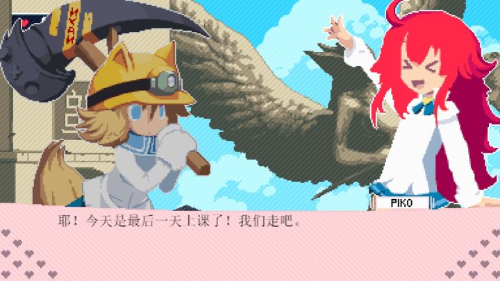 在玩法上为十分典型的横版地图探索类动作模式,玩家将操控Piko与Nyan前往不同的区域进行探索,游戏整体的自由度相对而言非常高。玩家在途中会遇到各种类型的敌人,所操控的Piko可以使用塑料大锤子对敌人进行攻击,跳跃在空中向下攻击则可以造成敌人眩晕效果,这时便可以肆意输出。锤子的攻击方式也多种多样,Piko在空中的时候可以发射光波攻击,冲刺之后可以释放风火轮大锤,具体使用哪种攻击方式还需根据实际遭遇的敌人来选择。