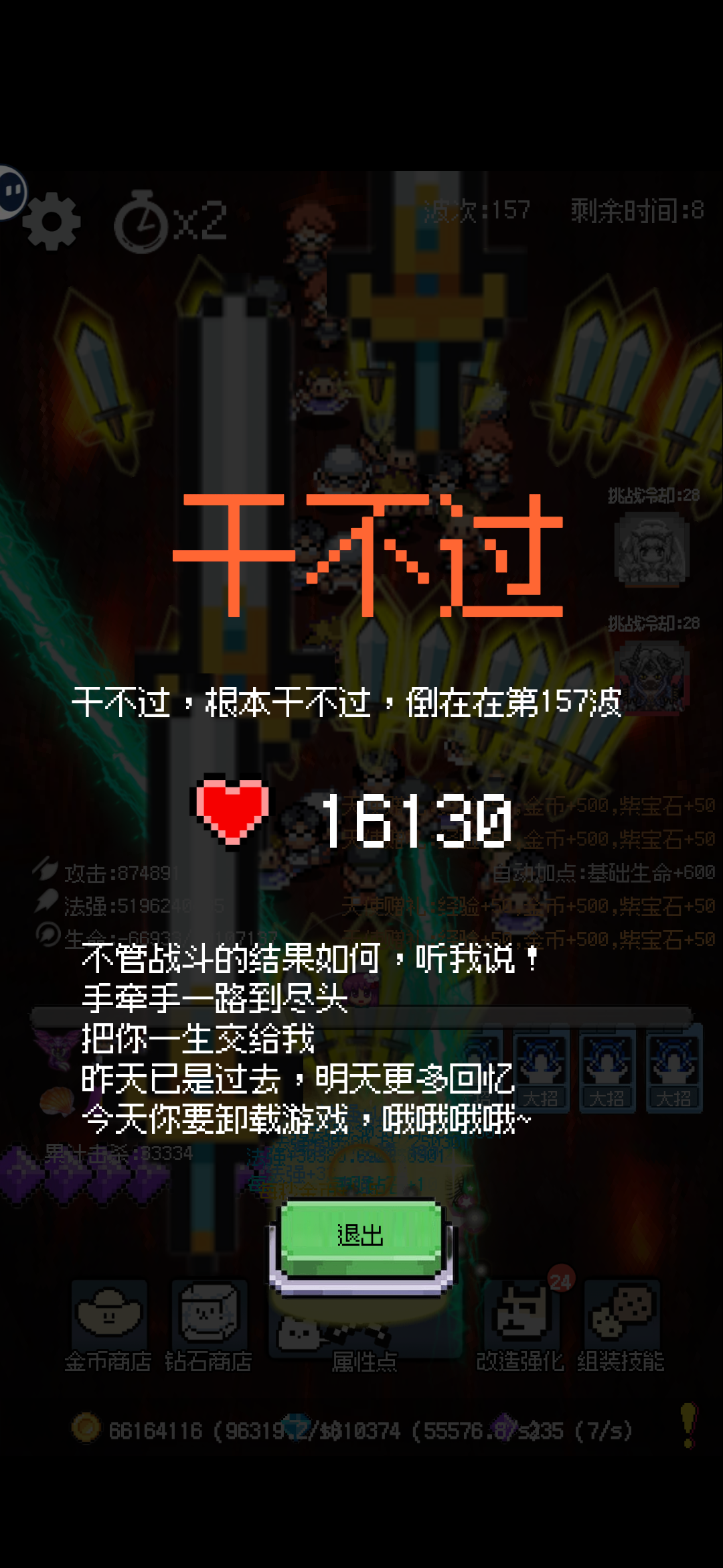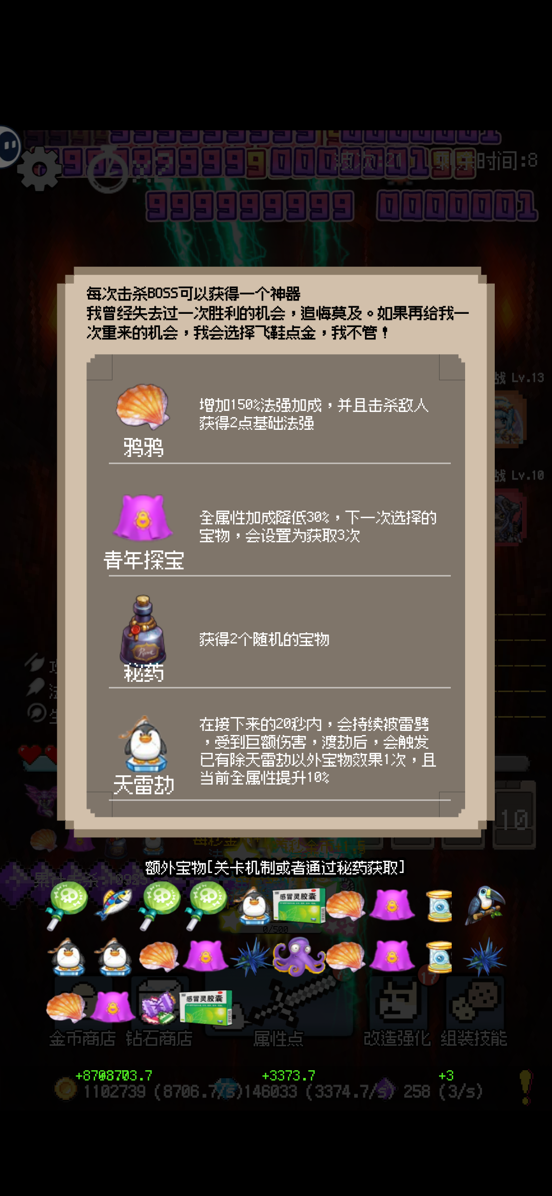 首先选到拼夕夕这个模式,如果不对就需要系统改时间因为几种玩法是系统轮换的核心原因是这波怪打不死就永远不会刷新,只需要你生命回复比这波怪攻击高,并且不攻击就会一直过关玩法:1.用恶魔猎手度过前期,然后进化英雄选蜡烛,因为蜡烛的被动是按比例加回复2.宝物第一个选生命加成,第二个选拳套()这样就不攻击了3.拼夕夕技能选挨打10万就会加额外生命值4.选以后不会出鹏哥5.挂机吧,不想打了就左上