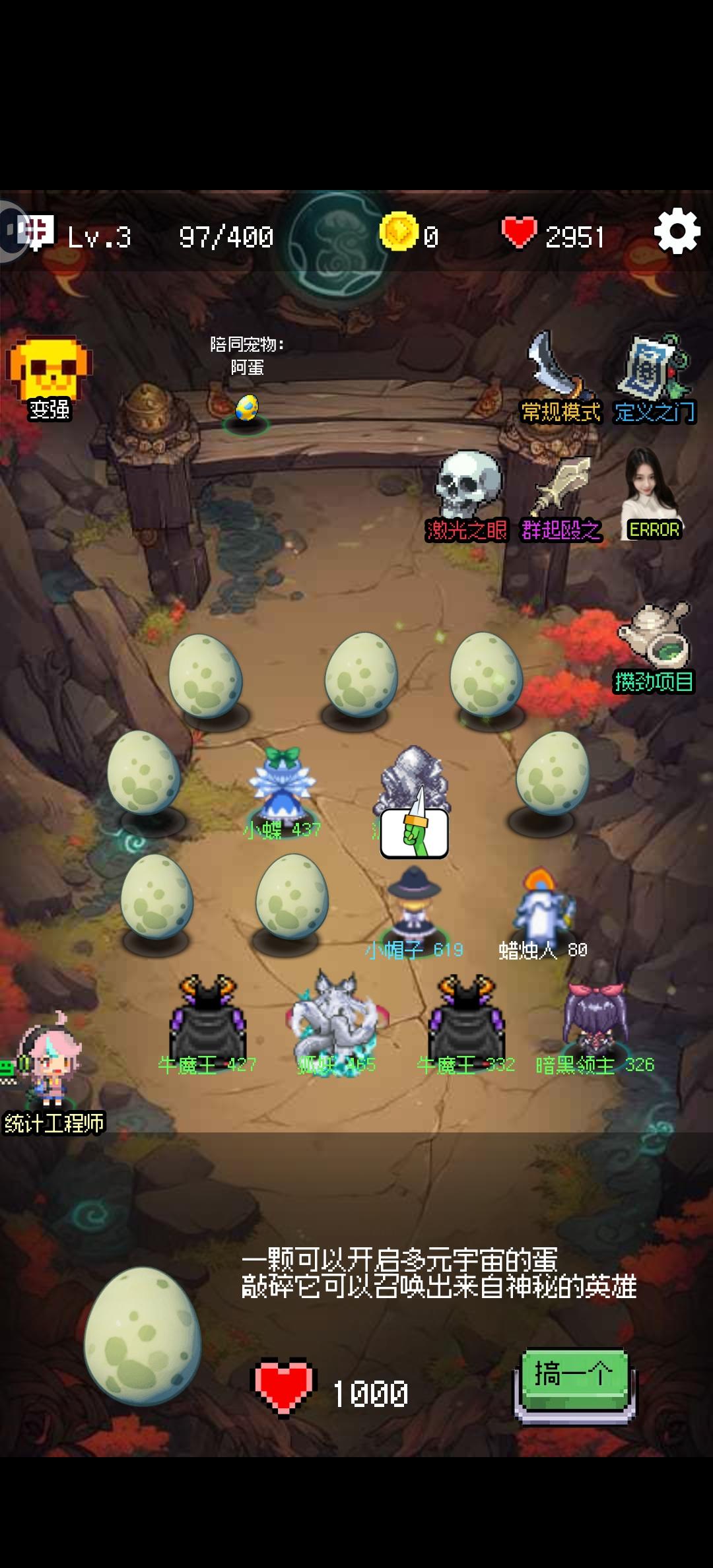 首先选到拼夕夕这个模式,如果不对就需要系统改时间因为几种玩法是系统轮换的核心原因是这波怪打不死就永远不会刷新,只需要你生命回复比这波怪攻击高,并且不攻击就会一直过关玩法:1.用恶魔猎手度过前期,然后进化英雄选蜡烛,因为蜡烛的被动是按比例加回复2.宝物第一个选生命加成,第二个选拳套()这样就不攻击了3.拼夕夕技能选挨打10万就会加额外生命值4.选以后不会出鹏哥5.挂机吧,不想打了就左上