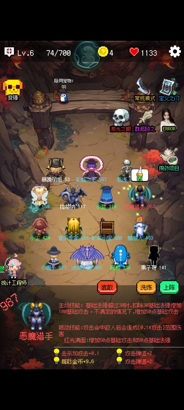 首先选到拼夕夕这个模式,如果不对就需要系统改时间因为几种玩法是系统轮换的核心原因是这波怪打不死就永远不会刷新,只需要你生命回复比这波怪攻击高,并且不攻击就会一直过关玩法:1.用恶魔猎手度过前期,然后进化英雄选蜡烛,因为蜡烛的被动是按比例加回复2.宝物第一个选生命加成,第二个选拳套()这样就不攻击了3.拼夕夕技能选挨打10万就会加额外生命值4.选以后不会出鹏哥5.挂机吧,不想打了就左上