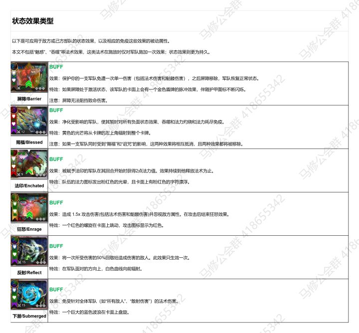 ✨本文介绍可应用于敌方或己方部队的状态效果,以及相应的免疫这些效果的被动属性。✨但不包括“魅惑”、“吞噬”等法术效果,这类法术在施放时仅对军队施加一次效果;状态效果则更为持久。—————————————————💪国人会战第一公会Marshal火热招募中!!!一起爆肝、一起吐槽、一起畅玩GOW——我们等你来战!群号:418655342。