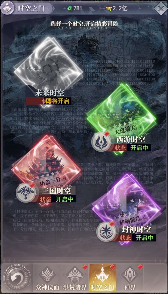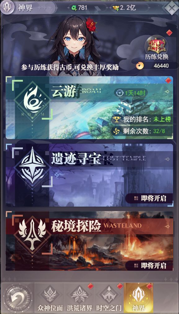 云游,是游戏里的一种特殊玩法,可以通过历练获得晶币,兑换丰富奖励。下面来介绍一下历练的所有玩法吧~ 神界云游:有几种玩法可以击败NPC以及玩家,建议玩家可以点击积分最高的去通过,有答题也有击杀对方获得奖励。积分能上排行榜,达到相应的排行能获得额外的奖励以及晶币。 时空之门:承载了各个时空的入口,玩家满足关卡和开服天数条件就可以解锁对应的时空,参与试炼及挑战玩法,获得月光精华获得对应时空的限