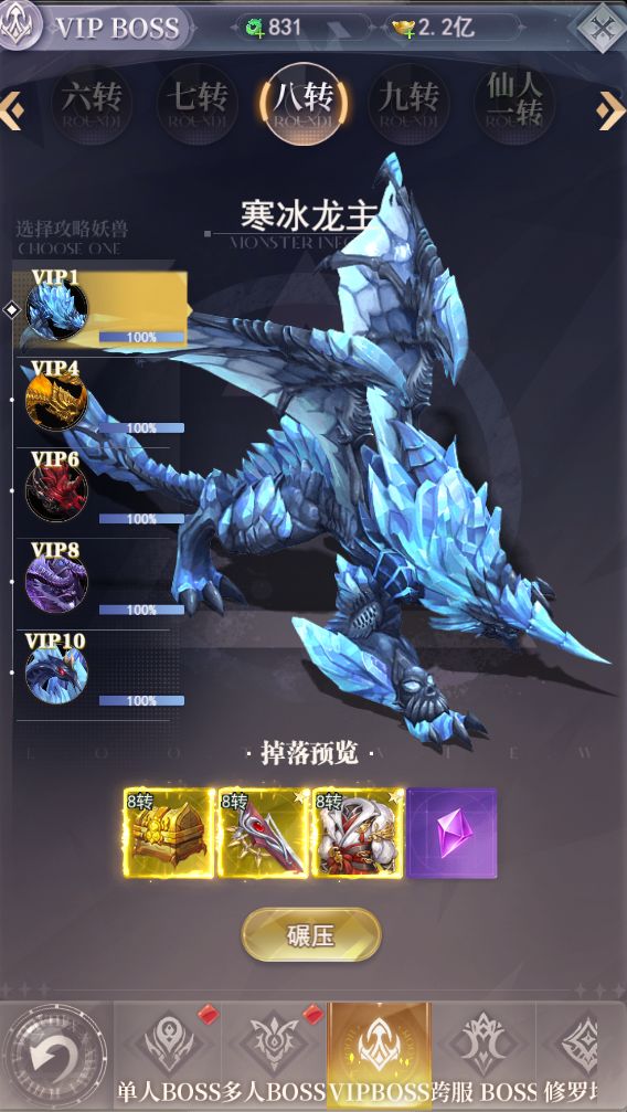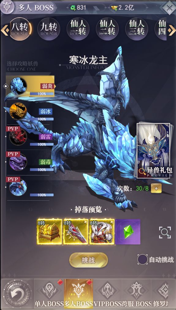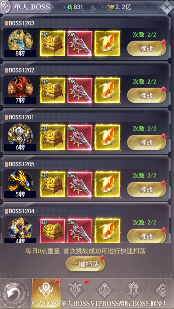 给大家提前唠唠boss篇哈~~BOSS篇: BOSS内集合了三界之内的各种大妖齐聚之地,下面我们来详细介绍一下这些藏宝之地吧! BOSS:通过挑战各种大妖,即可获得装备、宝石、神装等重要养成材料,每日挑战即可增强战力。 单人BOSS:顾名思义,玩家自己进行挑战的BOSS,每日限定挑战次数,获胜后即可获得对应转生的高品质装备,获得相同的三件装备可以去背包内进行打造升阶哦 多人BOSS: