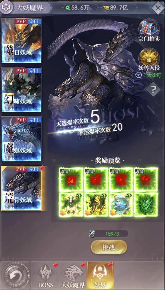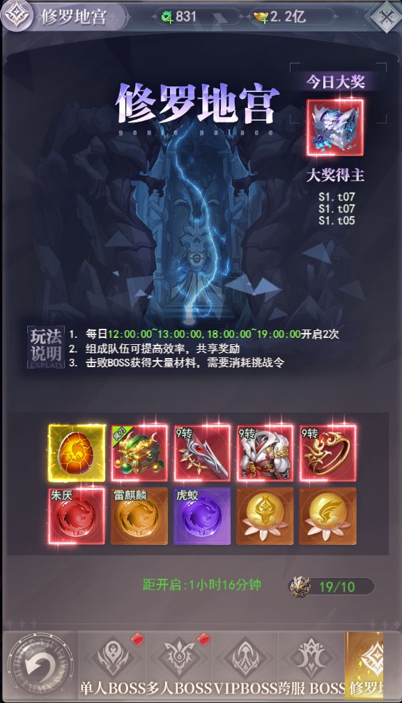 跨服BOSS:由开启时间限制的多人BOSS,每小时复活一次,除了装备外,每次挑战均可获得神装碎片,是神装养成的重要获取来源,同时积极参与场景内的随机时间,可额外获得丰厚奖励哦 修罗地宫:在游戏中,BOSS有一个独特的的玩法,那就是修罗地宫 修罗地宫最大的特点就是“限时”,修罗地宫只有在指定开放的时间内才可挑战。请留意开放倒计时哟,而且相同宗门的玩家可在副本内进行组队挑战,共同获得丰厚奖励,记住