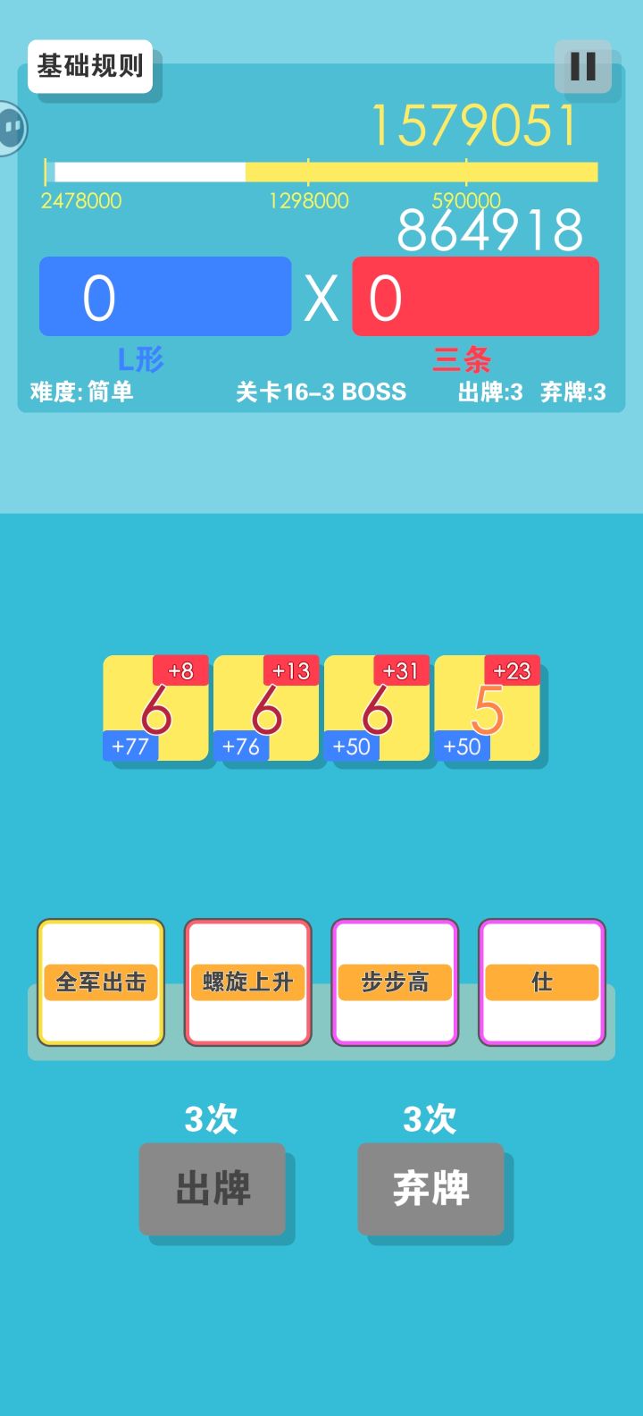 前期顺子。 中期左右上下 。缺蓝左缺红右 。后期堆乘数 。数值尽量堆中间格子 ,以免影响左右上下。技能成型后用弃牌弄除0 1外同数字的类似牌型吃全部乘数。限简单难度。