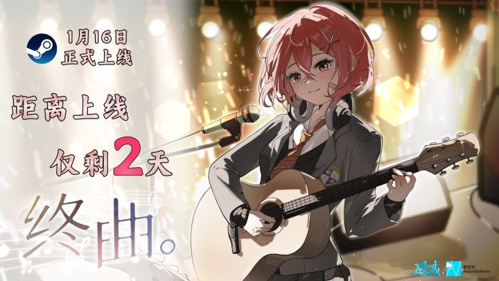 《终曲。》将于2026年1月16日正式发售!游戏定价为22元,首周享9折优惠,仅需19.8元!《终曲。》是由青空社AozoraSoftware开发,风域游戏发行的视觉小说。游戏以音乐与校园青春为主题,讲述了一个被摇滚所救赎的故事。人们总是会向很多事情妥协,给自己的情感以及内心套上一把锁。而音乐便是这把锁的钥匙,将所有的悲伤、愤怒、欢乐编织成曲。在梦想边缘挣扎的白石,偶然与神秘少女相遇,白