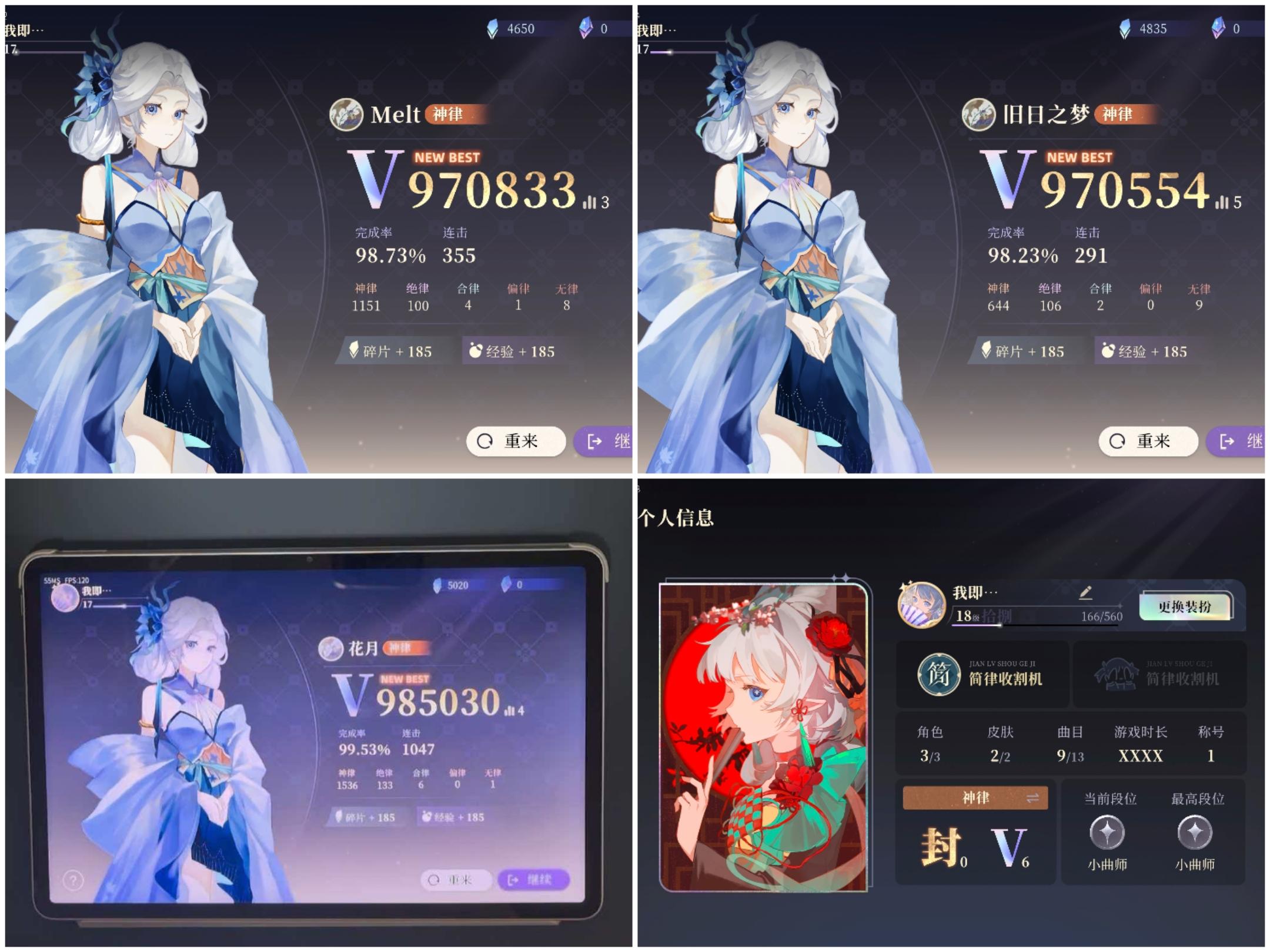 把目前能玩的几首都试了一下,不知道是不是我更习惯打下落式的原因,感觉上手还是有点难度的,节奏很快,目前神律只拿到了两个V