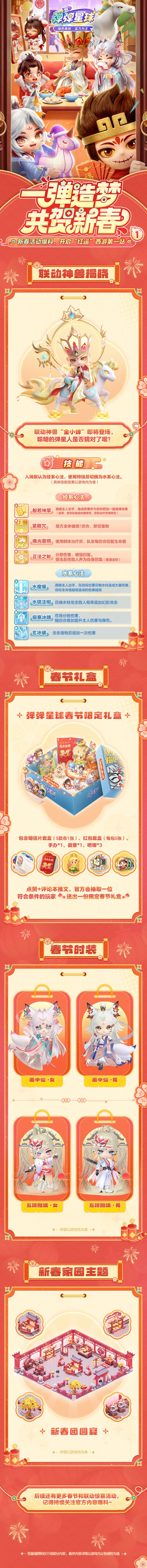 各位弹星人好呀~上篇的神兽和限定福利,是不是让大家狠狠期待住了!今天,新春前瞻下篇重磅来袭 ——迎春烟花、鸿运天降、家园拜年、画仙祈福……超多新春趣味活动,搭配新春专服专属福利,统统打包奉上~28天超长活动周期,玩法丰富福利拿到手软全服玩家还能免费领取春节限定动作【过年好】~这个春节,就在弹弹星球嗨玩到底,解锁满满红运!快来一起解锁详情吧~新春福利已全部解锁!2月