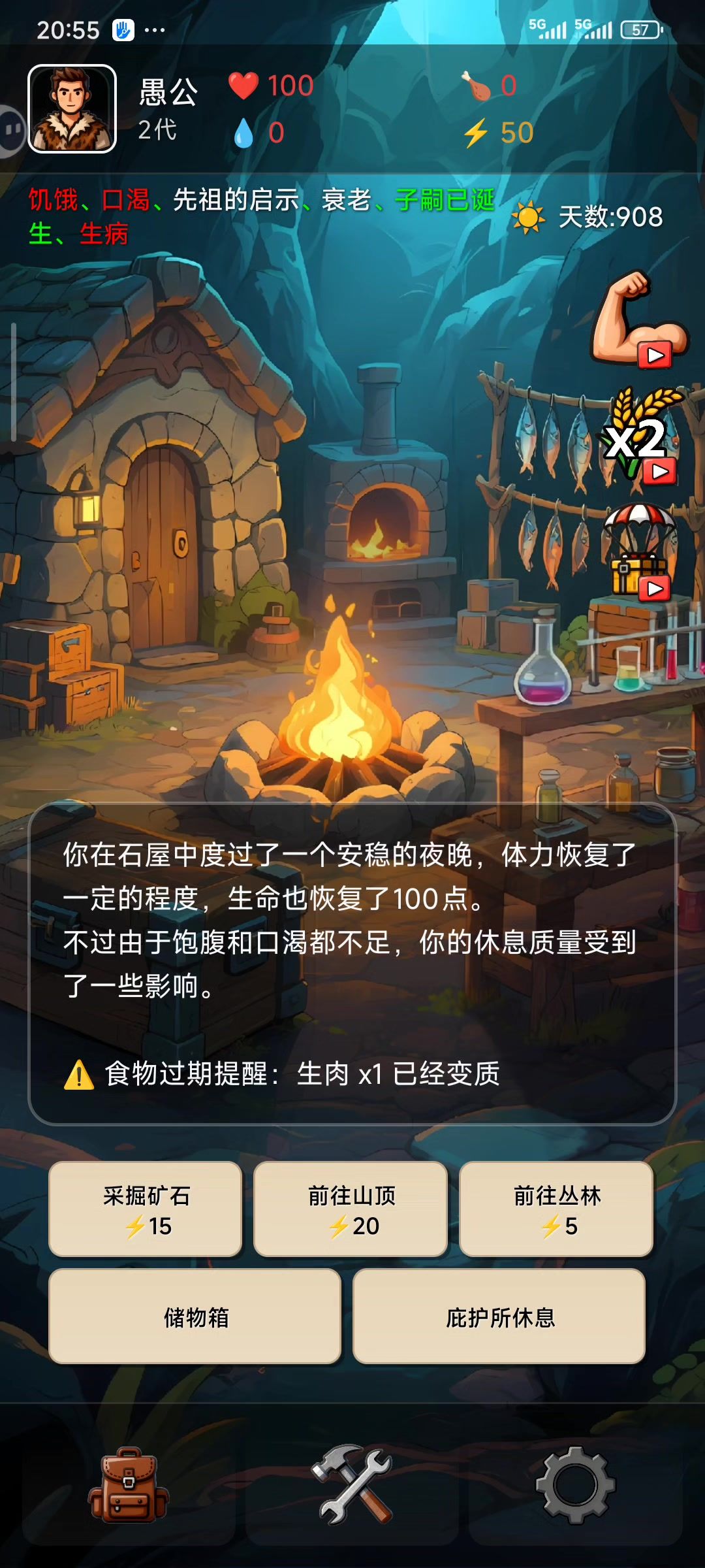 视频开头之前几年我就已经死了,我在房子里面死的,他当时没有弹出看广告保存全部遗物这个选项,我以为看错了,下意识点了下一天,然后发现不对,我没吃没喝血量照样回复满了100。 然后就去外面死,外面是能弹出选项了,但广告没弹出来,然后我就进入了丧尸状态,半活不死但能干活! 广告广告一直没弹出来,只进不出了,完美~#愚公海岛生存