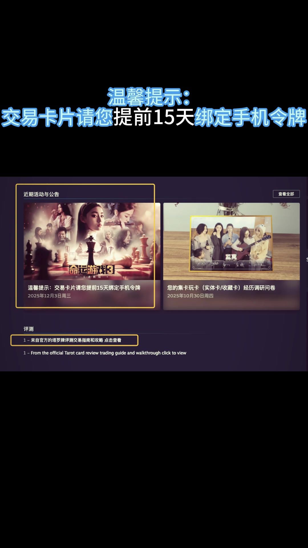 温馨提示:交易卡片请您提前15天绑定手机令牌 《命运游戏3:王者棋局》包含卡牌交易功能,如您要参与此系统,请提前做好以下准备。 特别重要的说明:如果你的STEAM ID是全新的,没有在STEAM平台消费过,并且也没有绑定过手机令牌,那么你可能无法使用我们游戏的交易所交易功能、无法使用交易所赠送功能。 请您提前15天绑定手机令牌,并且达到一定的消费额度。 如果您有消费且长期使用的ID,但是从未绑定过