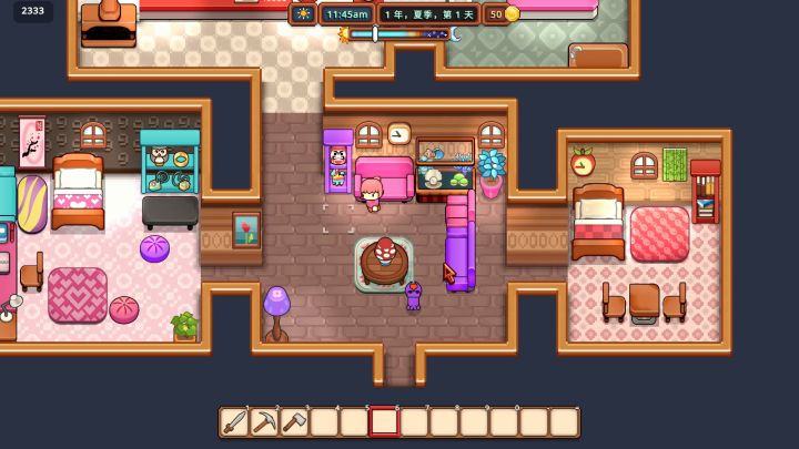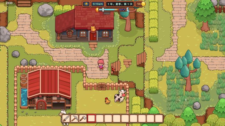 《Everafter Falls》这款游戏虽然有主线任务,但实际上采取的是弱引导的设计,玩家从一开始就有很高的自由度。主角初始就装备了剑(可以战斗,也可以除草)、斧头(可以砍树获得木材)、镐(可以挖石头等矿物质)三种实用道具,玩家的住宅附近在初期需要进行场地的清理才能进行下一步的耕种,我们的农场经营就是从这里开始的。