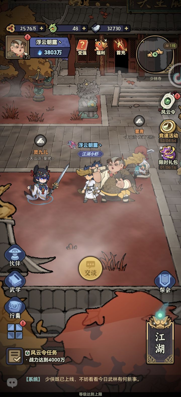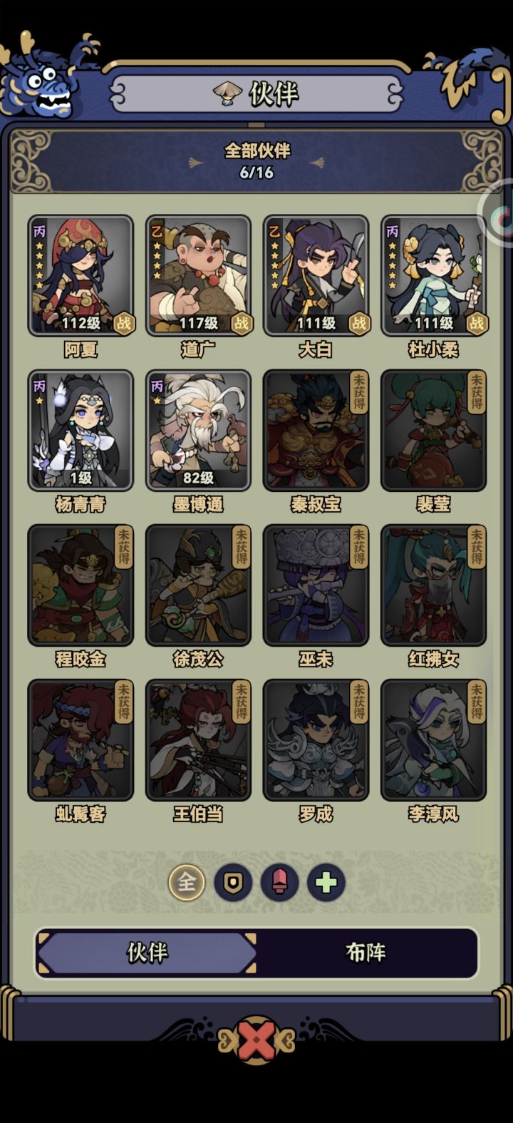 伙伴3个必带:大白(唯一禁疗)想办法堆血防不死就行(打水堂堂主必带)、李淳风(攻防血高加成高)攻防血高级书打满(撑属性)、徐茂公(唯一可以称得上治疗的)打猩猩必带堆血防不死就行。剩余1个:氪2000就秦叔宝(加伤,减盾),氪198就程咬金(减防),零氪就罗成(或者和尚、老乞丐都行反正没有辅助特性站得住就行,感觉罗成不如和尚,起码和尚还能辅助下团队,唯一PVP可以用用,有个挑飞控制,罗成属性加成也