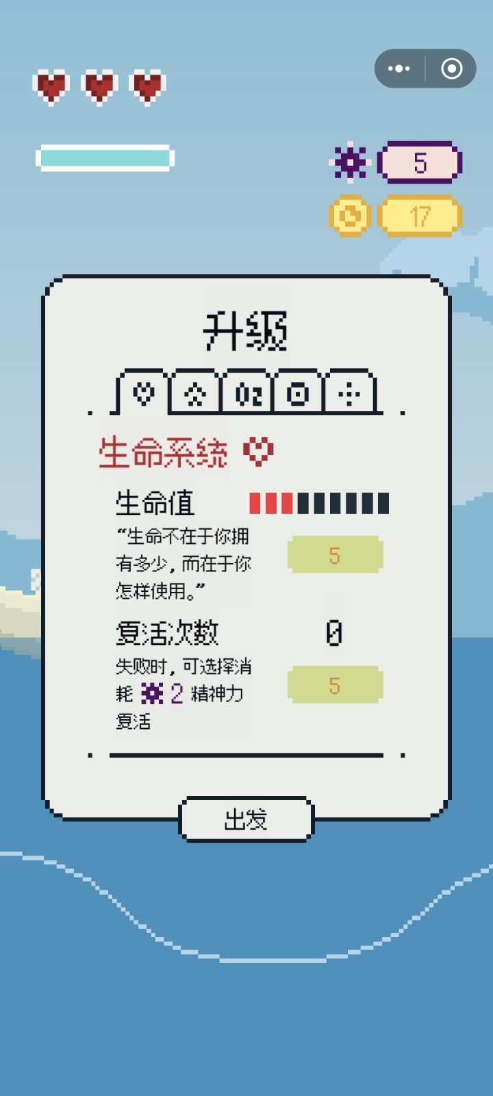 外围有养成,金币获得量取决于下潜深度,与其成正比。船头的仪器位置可以打开强化界面,消耗金币可以强化血量、下潜速度、氧气容量等属性。所需金币数量逐渐增多,都是固定值。数值没有被放大,是单机独游的常见设定。