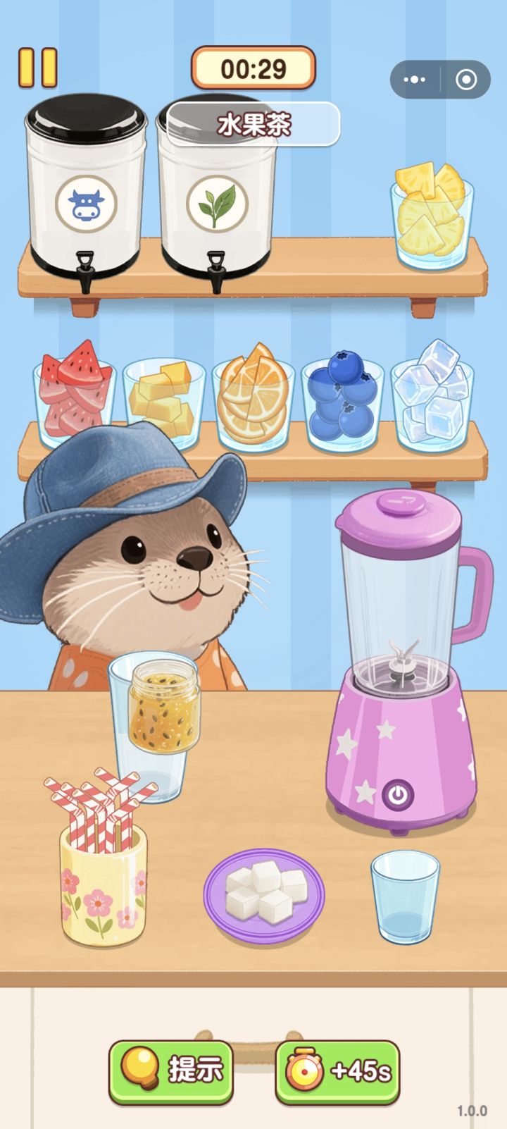 水果茶这关我是跳过的,碰到这种需要出餐的关卡一般有6个客户,每个饮料做半分钟。要看好多广告就不想看。而且这关的饮料好奇怪,光看图片还不一定能做对。