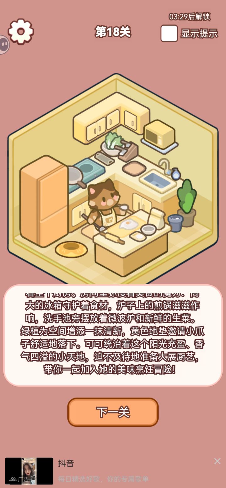 画风很可爱,是我喜欢的猫猫~每放成功一个东西,那个东西就可能是会动的,比如猫的话就是会动的,然后植物也会动,像被风吹的一样。