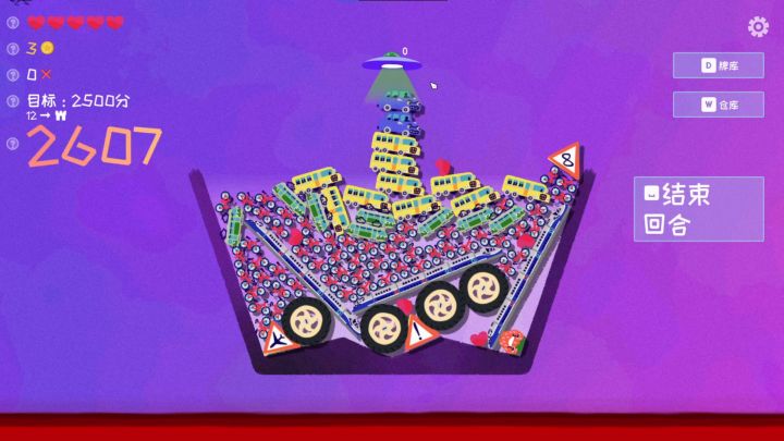 我第一次通关是用的存储流,顶着N个未达标拿的惩罚大轮胎过的。储存流很简单,不需要考虑摆放位置,无脑扔就可以。甚至有几次东西都掉出去容器,但是因为我手放的快,还没触地就在半空中合成了。最终合成的U盘时可以消除容器内除被动了之外的东西,加上一大堆分。而且U盘特别小,不占什么空间。