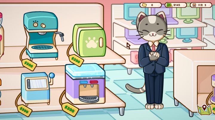游戏中摇下摇铃之后顾客便会出现提出要求,玩家需要在限时时间内选择拒绝或接受订单,玩家需要根据猫猫顾客的要求在限定的时间内来制作并交付饮品,根据玩家的制作速度和完成度来给予钞票。制作浓缩咖啡,玩家需要先打开柜子拿取咖啡放入搅拌,搅拌达标之后会有提示音,松手后把成品放在咖啡机里经过读条就可以获得浓缩咖啡。蒸汽牛奶也是在这个机器上,玩家需要把管子放在点点上经过读条获得蒸汽牛奶。普通非浓缩咖啡只需要放到另一个小的咖啡机上泡一下就可以了,而且可以制作多份饮品。吸管等其他配件也需要经过一段简单的QTE完成。